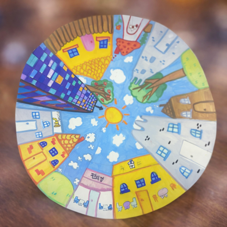 이 작품은 초등학교 2학년 여학생이 아크릴 마커를 사용해 1점 투시도법으로 표현한 도시 풍경입니다. 아이의 그림은 우리가 흔히 보는 ‘가로로 펼쳐진 도시’가 아니라, 하늘을 올려다보는 시선에서 시작됩니다. 화면 한가운데 환한 태양을 기준으로 건물과 길, 나무와 집들이 하나의 점을 향해 모이며 자연스럽게 1점 투시의 구조를 완성하고 있습니다. 특히 인상적인 점은 ✔ 아이가 투시를 ‘규칙’이 아닌 이야기 구조로 이해했다는 점입니다. 도시는 딱딱한 공간이 아니라 편의점, 주택, 높은 빌딩, 나무와 구름이 함께 어우러진 살아 있는 동네로 표현되어 있습니다. 원형 화면 구성은 마치 우리가 도시 한가운데 누워 하늘을 바라보는 느....... <img src="https://blogthumb.pstatic.net/MjAyNjAxMTRfMTI3/MDAxNzY4MzcyOTgwMDI3.JQ0JemxSqXLIUuQK2uI7bDStBBJy56lCEObflyxRyQIg.yO1Ok6yZFn3D9jl2Mo3IB4P1jJbRBiYr3L_EsjvvUGkg.PNG/%BE%C6%C5%A9%B8%B1%B8%B6%C4%BF%C8%AD%281%C1%A1%C5%F5%BD%C3%29.png?type=s3" />