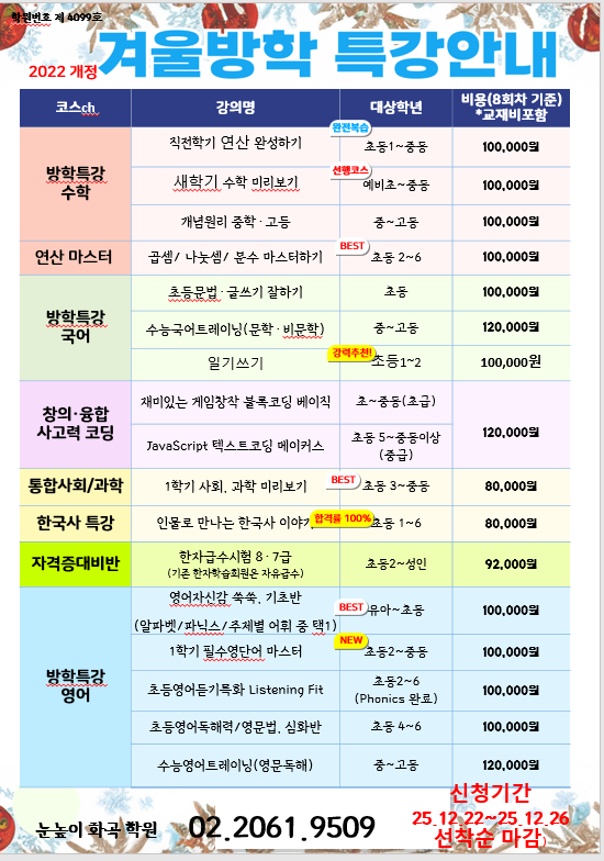 안녕하세요. 눈높이 화곡학원 입니다. 날씨가 많이 쌀쌀해지면서 우리 친구들도 겨울방학의 기대가 높아지고 있습니다. 조금 있으면 크리스마스도 되고 그리고 일주일 후에는 겨울방학이 시작되는 시기입니다. 이번 학기도 잘 마무리 하면서 겨울방학을 알차게 보낼 수 있도록 저희 선생님들이 학년별 맞춤 특강으로 이번 겨울방학 특강을 준비하였습니다. 수학특강 (기초부터 심화까지) 예비초3 : 분수,소수, 곱셈,나눗셈 연산 강화 예비초4 : 확대 곱셈, 나눗셈 , 복합 문제 해결 능력 향상 예비초5 : 약수,배수,분수의 통분,약분 완벽이해 에비초6 : 분수 사칙계산 완성 예비 중 : 정수와 유리수 혼합계산 완정 정복 초등 서술형 대비반 : 수....... <img src="https://blogthumb.pstatic.net/MjAyNTEyMTlfMTI3/MDAxNzY2MTEwMTQyNzQy.oMs2_rlB95vUEnwHMXhQ3bm2qELMkbMZcwHrecgBllAg.f1CknbLpg-5QqeoOvQoj472gqdg29hlduxYoNusOIcAg.PNG/KakaoTalk_20251218_145045161.png?type=s3" />