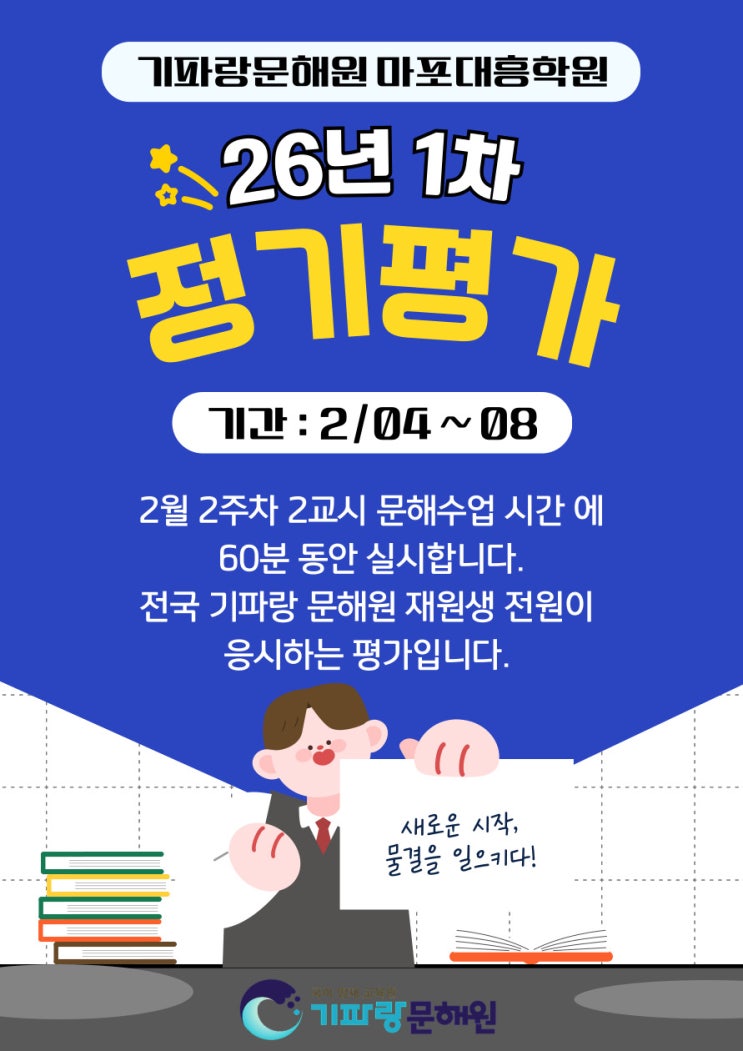 안녕하세요? 26년 1번째 [정기평가]가 다가오고 있습니다. *기간: 26.2.04(수) ~ 2.08(일) *준비물 : 컴퓨터용 싸인펜 2월 2주 차에 결석 시에는 학원으로 연락 주셔서 개별 응시 일시를 정해주세요~ *2월 2주차 수업 (2교시 문해수업시간) 때에 60분동안 진행합니다. ■ 정기평가란 전국 기파랑문해원 재원생 전체를 대상으로 하는 시험입니다. 총 32문항 (객관식 30문항, 주관식 2문항)을 60분간 풀게 됩니다. "입학테스트"와 구성과 수준이 동일합니다! 재원생들은 짝수월 2주차마다 정기평가를 보는데요. 그러므로 한 학기, 즉 6개월 동안 총 3번의 정기평가를 보게됩니다. ■ 정기 평가는 재원생들의 학업성취도를 파악할 뿐만 아....... <img src="https://blogthumb.pstatic.net/MjAyNjAxMTFfMjE5/MDAxNzY4MTA5MzUxNDE5.uEpDZfT3NMqkpPPcTr0jyItUydE3tR858rrbHk8Mu1gg.dj9GoNXVcBbt2lgIaExBhs8y-skfG-niEQaZqYZOyVgg.JPEG/2%BF%F9_%C1%A4%B1%E2%C6%F2%B0%A1.jpg?type=s3" />