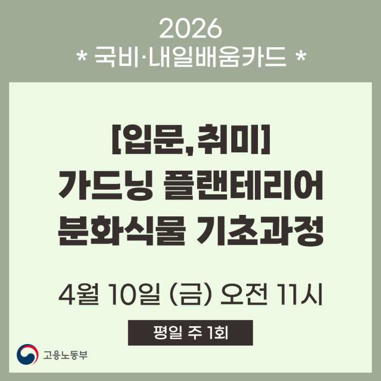[ 국비과정 / 내일 배움 카드 / 평일반 ] *해당 수업은 국비 [창업과정] 가드닝 플랜테리어 전문가반과 다른 과정입니다. 안녕하세요! 지오지오 플로리스트 학원입니다. 기존에 일반(정규) 수업에서만 받아볼 수 있었던 가드닝 과정을 내일 배움 카드를 이용해 국비지원으로 훈련할 수 있는 초보/입문 반입니다! 기초가 필요한 초보자 분들에게 추천드리는 과정이며, 선인장도 죽이는 프로 살식마 분들도 식물에 대해 한 층더 가까워질 수 있는 과정으로 적극 추천드립니다! 실업자, 구직자, 창업 준비, 국취제1유형, 국취제2유형 등 모든 유형 신청이 가능하며, 내일 배움 카드가 신청이 어려운 분들도 자비 100%로 지원이 가능한 과정입니....... <img src="https://blogthumb.pstatic.net/MjAyNjAzMTJfMjUx/MDAxNzczMjkxMDkzMzI1.OCugIdmuDnOC-xjyyiMuz7vf_zv0s162gCYQFGGYg3og.Kq2G4OGOPOsYSdMr8MHQlibQalCZeTyqeeMSVKuZaLcg.JPEG/%B0%A1%B5%E5%B4%D7.jpg?type=s3" />