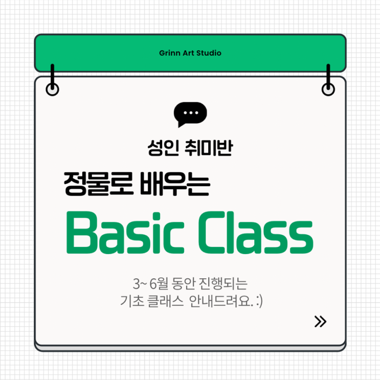 **기존 신청으로 대부분 마감되어 잔여석만 추가 모집합니다 미술의 기초를 체득해야 나 자신의 그림을 그릴 수 있어요. • 스케치부터 채색의 기초까지 그림의 기초를 배우고 싶은 분 • 회화 작업시 깊이 있는 완성도와 피드백을 원하시는 분 • 데생, 수채화에 관심 있으신 분 수업 개요 • 대상: 성인 • 기간: 3월 19일 또는 26일 ~ 8월 (6개월 과정, 평균 월 4회) • 정원: 6명 • 수업 시간 (90분) - 목요일 저녁 7:30 - 9:00 ✏️ 무엇을 배우나요? 정물화는 ‘관찰’을 기반으로 미술의 기초를 가장 단단하게 다질 수 있는 장르입니다. 회화는 결국 제한된 평면 안에서 시각적 세계를 구성하는 작업이기 때문에, 기초적인 관찰....... <img src="https://blogthumb.pstatic.net/MjAyNjAzMTNfMTYx/MDAxNzczNDAzNzg5MzMx.iUhol9n59gr2WkmJjWHdjaevQmHPguQBolbUbX_KGUEg.KVppg6FqbP2kQUrCVxmxO_a78H5QIVlkQDOD39xoaRAg.PNG/%C3%CA%B7%CF%BB%F6%B0%FA_%C8%B8%BB%F6_%BD%C9%C7%C3%C7%CF%B0%ED_%B1%F2%B2%FB%C7%D1_%BA%F1%C1%EE%B4%CF%BD%BA_%B4%BA%BD%BA_%C0%DB%BC%BA_%BF%E4%B7%C9_%B5%F0%C0%DA%C0%CE_%C5%DB%C7%C3%B8%B4_%C0%CE%BD%BA%C5%B8%B1%D7%B7%A5_%C4%AB%B5%E5%B4%BA%BD%BA_%A3%AD_1.png?type=s3" />