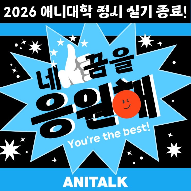안녕하세요 여러분 애니톡 목동 본원입니다 ! 정신없이 달려오던 2026학년도 입시 마라톤의 끝이 다가왔습니다. You're the best! 2026학년도 애니 대학 정시 다군까지 입시 마무리 ! 금일 1월 28일(수)을 끝으로 애니,만화 대학 정시 다군까지의 모든 실기 일정이 마무리 되었습니다! 이제 정시 합격자 발표 ~26년 2월 2일(월)까지 추가 합격자 발표 ~26년 2월 12일(목)까지 결과를 기다리는 일만 남았습니다 ! 9월 수시부터 1월 정시까지, 자신의 꿈을 위해 이악물고 끝까지 달려온 우리 모든 수험생 여러분! 모두 수고하셨습니다!! 매년 대박 합격 결과! 선생님들의 노하우와 학생들의 열정이 모여 우리 아이들의 꿈을 실현시키는 애니톡....... <img src="https://blogthumb.pstatic.net/MjAyNjAxMjhfMTYx/MDAxNzY5NTQ1MDE5NjMw.Q11zTT1_HMc0GWVBP_eFgn4xogJyoIVxkZ5w0LVcowkg.Sr2YoqyvzMTC_CNHKVM9or1RsfZEVQ_3NBnaYvl9Vvsg.JPEG/%C1%A6%B8%F1%C0%BB_%C0%D4%B7%C2%C7%D8%C1%D6%BC%BC%BF%E4.-_%BA%B9%BB%E7%BA%BB.jpg?type=s3" />
