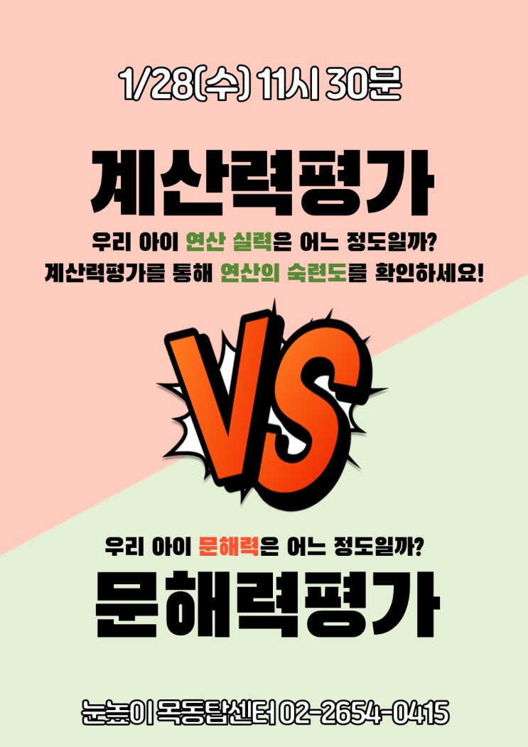 오늘 1월 28일 수요일 오전 11시 30분, 눈높이 목동탑센터에서는 아이들의 학습 상태를 점검하기 위한 계산력 평가 & 문해력 평가를 진행했습니다 아이 수준에 맞춘 계산력 평가 계산력 평가는 ✔️ 아이가 현재 연산하고 있는 진도에 맞춰 급수를 개별 설정해 무리 없이, 하지만 정확하게 실력을 확인할 수 있도록 진행했어요. “잘 풀 수 있을까?”보다 지금 어느 단계까지 탄탄하게 이해하고 있는지를 확인하는 게 목적이기 때문에 아이들 부담은 줄이고, 결과의 신뢰도는 높였습니다. 학년별로 다른 문해력 평가 진행 문해력 평가는 학년별 발달 단계에 맞춰 평가지도 다르게 준비했습니다. 1~2학년 솔루니 문....... <img src="https://blogthumb.pstatic.net/MjAyNjAxMjhfNzAg/MDAxNzY5NTgzNzI5MDcy.nrQ8Jet7whEI3j5jCQCW2zQVjiysYNyciedgyiCv1M0g.ychgNPLMWawqkreJqndIhImR2SQhn4LtNyVzgx3hpDgg.JPEG/%BD%BD%B6%F3%C0%CC%B5%E51.JPG?type=s3" />