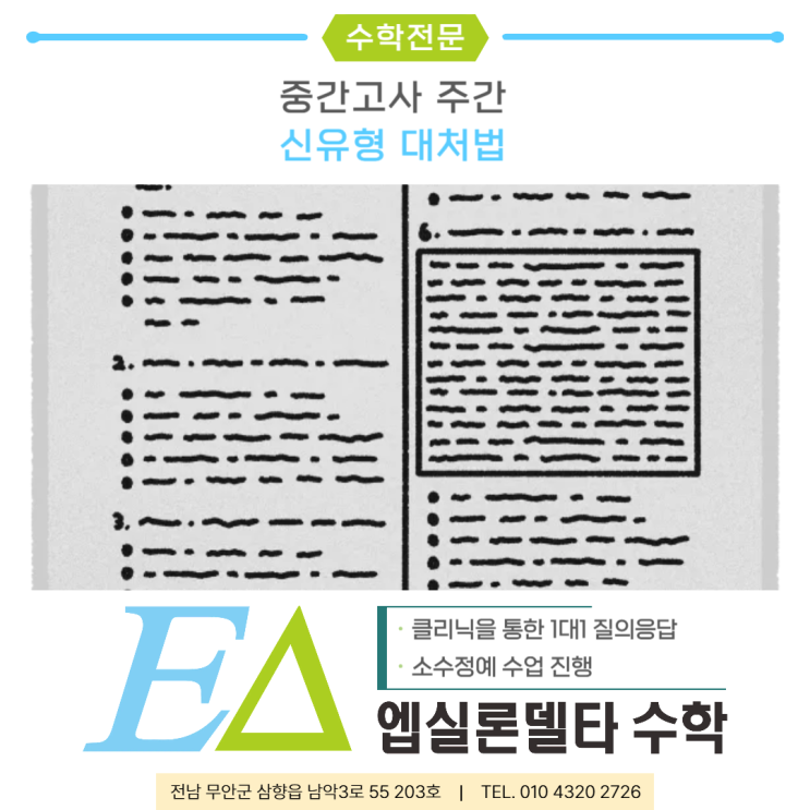 안녕하세요~ 미래엔 남악 라온 수학 학원 윤정쌤입니다. 어느새 벚꽃도 지고 푸른잎이 돋아가며 포근한 날씨가 이어지네요. 우리 미래엔 남악 라온 수학 학원은 26년도 1학기 첫 시험을 준비하는 학생들의 열기로 학원 내부는 더 따뜻하게 느껴집니다^^ 이제 중간고사가 열흘 남짓 앞으로 다가왔는데요, 약점은 보완하고 실전 감각은 극대화하는 시간을 보내고있는 우리 친구들! 개념을 복습하고 다양한 유형의 문제를 풀며 자주 틀리는 오답문제들을 모아 분석하고 기출문제들을 풀면서 실전감각을 익히고 있습니다. 학습이 어느 정도 마무리된 친구들을 대상으로 이번 주 금요일과 토요일을 활용해 "미래엔 전국 중간고사"에 응시할....... <img src="https://blogthumb.pstatic.net/MjAyNjA0MTVfMyAg/MDAxNzc2MjM1OTY3MzI5.8tmw9YQR-dqcV9jRk939lZsPFIj5FASZJILFfw5Y4fkg.Oo26DkKe0TBEgea1fjdez0t4AFjIzcvcIthCau6bCTwg.PNG/%C1%A6%B8%F1%C0%BB_%C0%D4%B7%C2%C7%D8%C1%D6%BC%BC%BF%E4._%2812%29.png?type=s3" />