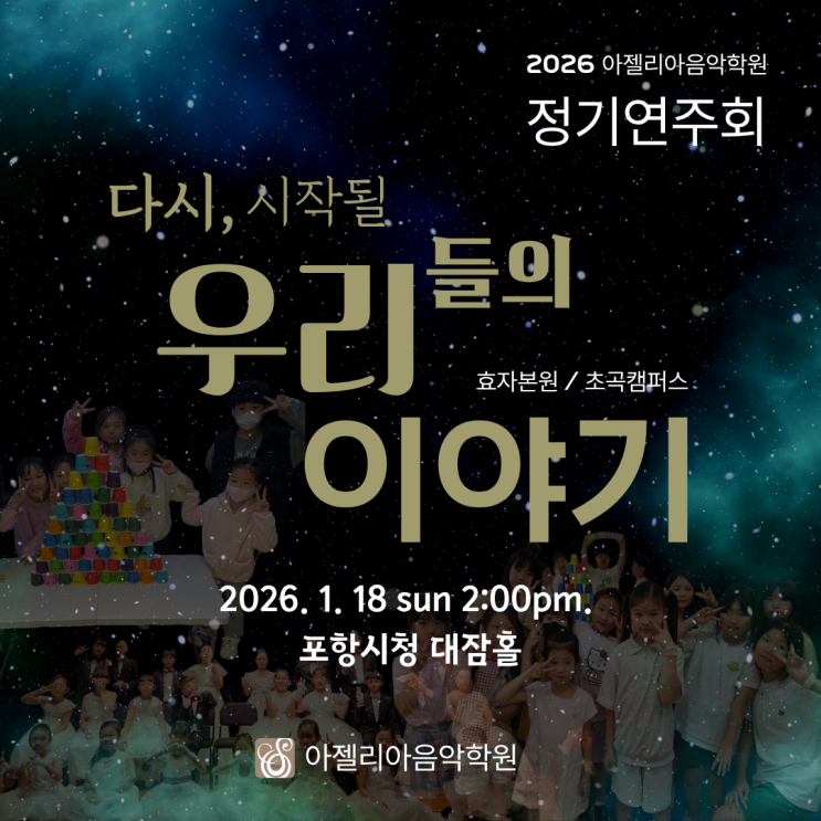2026 다시 시작될 우리들의 이야기 아젤리아 정기 연주회 그날의 감동을 전달드려요 Opening 오프닝 무대를 시작으로 연주회의 서막이 시작 됩니다. 오프닝은 매회 새로운 아이디어들로 달라지기도 하는데요 이번에는 선생님들의 응원영상, 아이들이 쓴 손편지, 연주회 준비 영상으로 펼쳐 졌습니다. 틀려도 아무말 말아 달래요. ㅋㅋㅋ 우리 친구들도 진심 입니다. 연주회 준비는 생각외로 부담감 느끼기 보다는 여러가지 장기들을 준비 하면서 친구들과 연습하는 시간은 놀이 시간이 되곤 합니다ㅎㅎ Solo 연주 아젤리아 연주회는 본원과 초곡캠퍼스의 콜라보로 진행되어 다양한 연주와 퍼포먼스 무대가 펼쳐집니다. Duet 연주 학년별 또는 친....... <img src="https://blogthumb.pstatic.net/MjAyNjAxMjdfNTMg/MDAxNzY5NTA3MzA1MjAz.wmi0qs-Vfc_KrTbd_5IlckUNROR4c_LLPc3fuvirD9Ug.41-9nLvkizLGKCKHmbqkfbzON87yhcX-GAgBkNX2jawg.PNG/KakaoTalk_20251127_142228308.png?type=s3" />