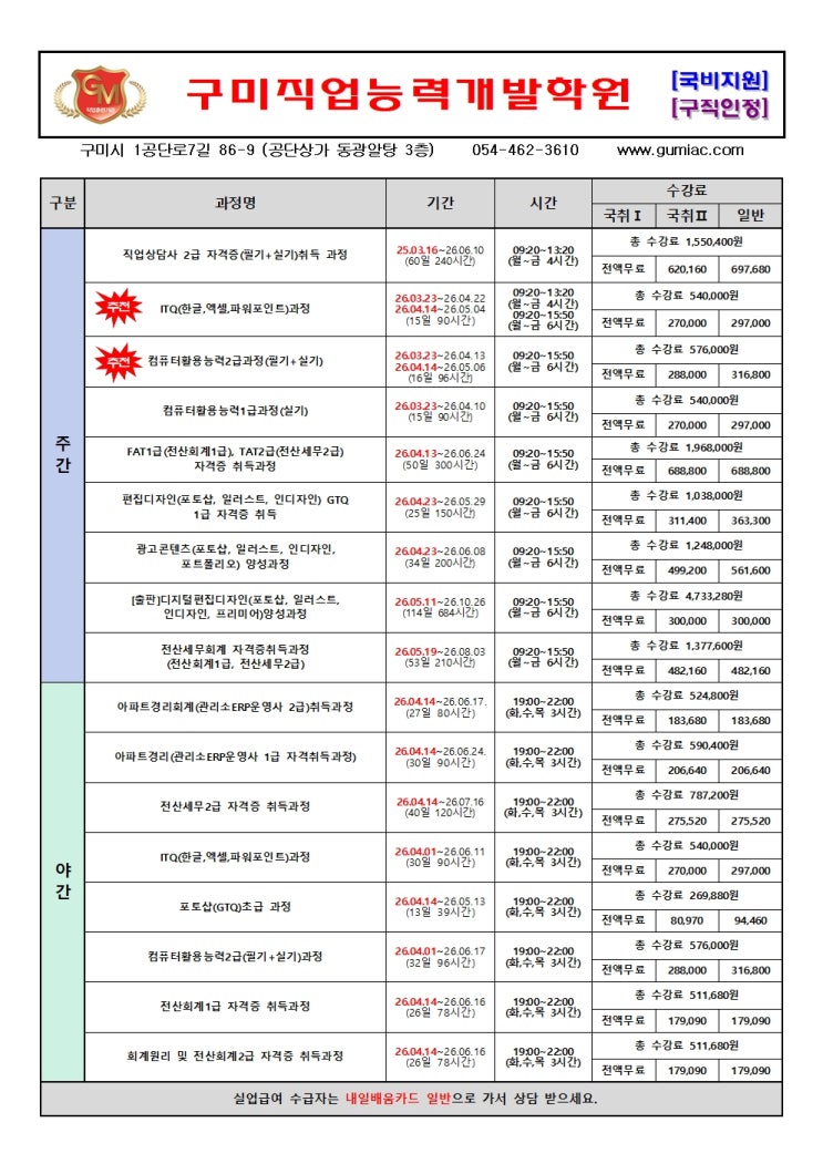 2026년 3월12일 개강 안내 구미직업능력개발학원 최신 교육과정 일정표 구미직업능력개발학원의 2026년 상반기 교육과정 개강 일정을 안내드립니다. 회계·세무·사무·디자인·자격증 과정까지, 취업과 실무에 바로 도움이 되는 과정들을 체계적으로 운영하고 있습니다. 이번 개강 일정은 ✔ 주간 / 야간 과정 구분 운영 ✔ 국비지원·구직인정 과정 포함 ✔ 자격증 취득 중심 실무 과정 구성 으로 수강생 상황에 맞춰 선택하실 수 있습니다. ✅ 주요 운영 과정 안내 전산세무·전산회계 자격 취득 과정 컴퓨터활용능력, ITQ, GTQ 등 사무·디자인 자격 과정 직업상담사 2급 자격 취득 과정 아파트경리회계, ERP 실무 과정 편집디자인·광고콘텐츠....... <img src="https://blogthumb.pstatic.net/MjAyNjAzMTJfMjY2/MDAxNzczMjkzMDU3MjEw.fn8kcgMuVRMW3o5wZUnXafuxWPeuXlq_IHoBhIL5Ps0g.3wZpqcrQX61i9gr7y5oy-XT3TZ4BY_jfmzfeOYukKfYg.JPEG/%C8%AB%BA%B8%C0%FC%B4%DC%C1%F6%2826.03.12%29.jpg?type=s3" />