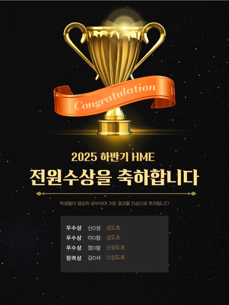 #천재교과서 #스마트해법수학 #해법수학 #상도동수학학원 #상도동공부방 #상도동학원 #상도동초등수학 #상도동중등수학 #신상도초수학학원 #신상도초공부방 #신상도초학원 #신상도초등학교 #상도초등학교 #장승중학교 #국사봉중학교 #상도동더샵 #상도동아이파크 #상도동롯데캐슬 #상도푸르지오클라베뉴 #일대일학습 #2025년하반기HME #전원수상 #HME경시대회 안녕하세요~ 학부모님들 스마트해법수학신상도점 친절꼼꼼김쌤입니다 오늘은 우리 해법이들 자랑과 축하를 해보려고합니다!! 스마트해법수학 신상도점에서는 매년 2회 HME 수학학력평가 준비 및 응시를 하는데요~ 지난 11월 15일에 치뤄졌던 하반기 평가에서 응시자 전원 수상을 했....... <img src="https://blogthumb.pstatic.net/MjAyNTEyMTVfMTc0/MDAxNzY1Nzk2MTUxMDc5.w0lgkD9cdrR1WieNDSg5KNxffXudUlmHhN0Yida31Pcg.EjuJ26RAgBXUokKNhuVgJ2hvRlMZu3NQcQ3-fV8Hxawg.JPEG/900%A3%DFScreenshot%A3%DF20251215%A3%DF122337%A3%DFKakaoTalk.jpg?type=s3" />