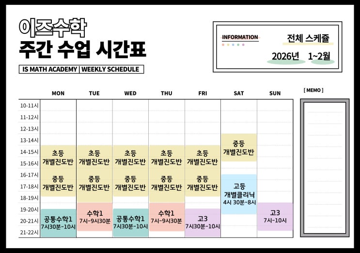 대방동 수학학원 이즈수학-2026년 1·2월 주간 시간표