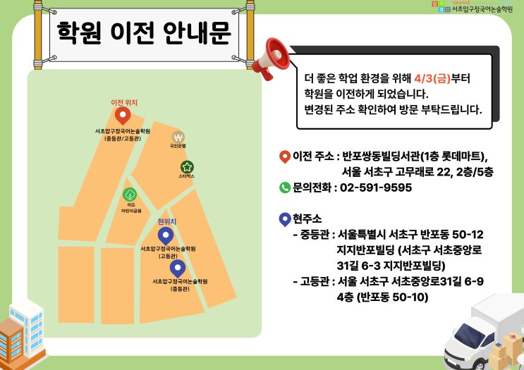 < 학원 이전 안내_4월 > 더 나은 교육 환경을 위해 저희 학원이 확장 이전을 하게 되었습니다. 4월 3일(금)부터는 아래의 변경된 주소로 등원 및 방문 부탁드립니다. 감사합니다. ■ 이전 일자 : 4/3(금) ■ 새 주소 (중/고등관) : 반포쌍동빌딩서관 2층,5층 - 1층에 롯데마트 있는 건물입니다. - 서울 서초구 고무래로 22, 2층,5층 ▷자세한 문의사항은 학원으로 연락주시기 바랍니다. ▷매주 월, 화요일은 휴무입니다. ☎ 중등관 전화문의 02-591-9595 / 문자 010-5125-9700 ☎ 고등관 전화문의 02-2088-3333 / 문자 010-6819-9800 <img src="https://blogthumb.pstatic.net/MjAyNjAzMDZfMjQx/MDAxNzcyNzg5NjYyNDgy.nG-ujspdvldJdJyZvNuBhHNnZifVf--FTnXcYtrldhcg.4gOJqGa9UOxSGvFQ6Vz4FzEgVKGTMD-7X4QCV6rEozog.JPEG/%C0%CC%BB%E7%BE%C8%B3%BB%B9%AE_%B9%DF%BC%DB%BF%EB_-001_%281%29.jpg?type=s3" />