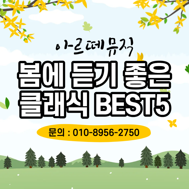 봄에 듣기 좋은 클래식 5곡 내방역 성인 피아노 학원 아르떼뮤직 안녕하세요. 아르떼뮤직 음악학원입니다! 오늘은 따뜻한 봄날, 기분 좋은 햇살과 함께 듣기 좋은 클래식 음악 5곡을 소개해 드릴게요! 오늘 소개하는 곡들은 학원에서 피아노, 바이올린 등 다양한 악기를 배우는 수강생분들도 즐겨 연주하는 곡들이랍니다. 1️⃣ Vivaldi – Spring (The Four Seasons) 비발디의 대표작 사계 중 ‘봄’은 상쾌한 봄의 기운을 그대로 느낄 수 있는 곡이에요. 피아노, 바이올린 등 다양한 악기로 연주 가능하며 경쾌한 리듬과 밝은 멜로디가 특징입니다. 2️⃣ Chopin – Nocturne Op.9 No.2 쇼팽의 녹턴 2번은 부드럽고 감미로운 선율이 매력....... <img src="https://blogthumb.pstatic.net/MjAyNjAzMDdfMjk2/MDAxNzcyODcyMDAyNjQ1.aX4DlWPTAHcNZcgJUFpE2c9vE-kvrfH1ZFc1PoCYimMg.tYrPFJPOZwhScc2dAHzQI16M1ZCJsKwCMxlHHobVb8Mg.PNG/%C1%A6%B8%F1%C0%BB_%C0%D4%B7%C2%C7%D8%C1%D6%BC%BC%BF%E4._%283%29.png?type=s3" />