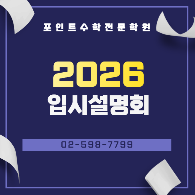 안녕하세요. 포인트수학전문학원입니다. 입시를 준비하는 학생과 학부모님을 위해 포인트수학전문학원 2026 입시 설명회를 개최합니다. 이번 설명회에서는 ✔ 고교별 학습 방향 ✔ 내신·수능 대비 수학 학습 전략 ✔ 학교별·학년별 준비 포인트 등을 중심으로, 실제 입시에 도움이 되는 핵심 내용만을 정리해 드릴 예정입니다. 수학은 아는 것이 곧 힘이 되는 과목입니다. 막연한 불안 대신, 정확한 정보와 전략으로 준비하고 싶다면 이번 설명회를 통해 방향을 잡아보시길 바랍니다. 설명회 일정 안내 1차 2월 3일(화) 7시 동덕여고 / 8시 서초고 2월 5일(목) 7시 상문고 / 8시 서울고 2차 2월 24일(화) 7시 동덕여고 / 8시 서초고 2월 26일....... <img src="https://blogthumb.pstatic.net/MjAyNjAyMDNfOTIg/MDAxNzcwMDk2MDQ0MTA1.WmOnyrmaH-ND3MLchP53xhsjXpaX3mIKdrMbmD6SG4Eg.hJftPl2Jrf2MzlVBDwlzdeK7GltKtP2s87FFcqbrxmYg.PNG/image.png?type=s3" />