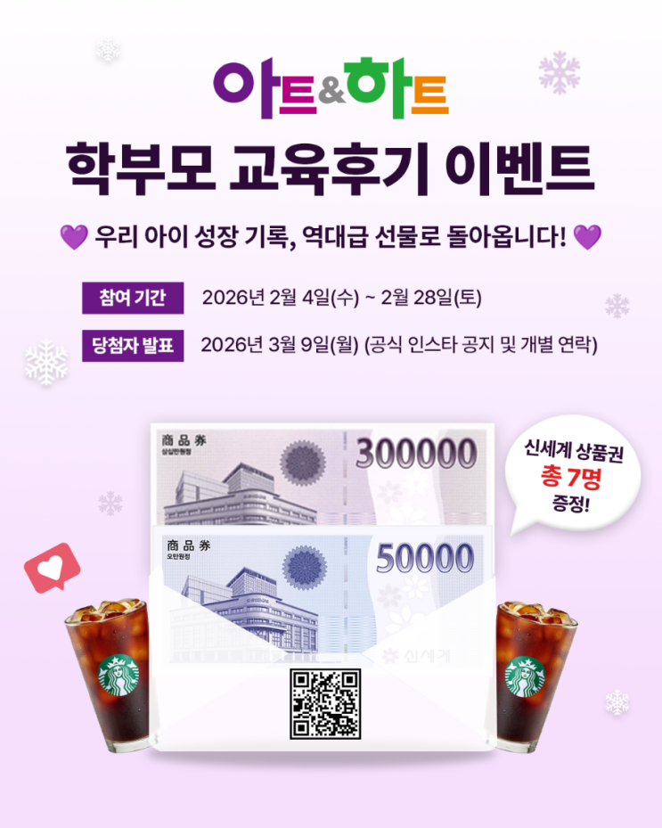 2026년 아트앤하트 학부모 교육 후기 이벤트 공지합니다.~ 아트앤하트와 인연을 맺은 우리 학부모님들께 깜짝 이벤트가 있어서 알려드립니다 학부모 교육 후기? 뭔가 쉬운 듯 어려운 것 같죠~ 아트앤하트를 좋아하는 우리 아이 학부모님이시면 일단 한번 도전해 보시는 건 어떨까요?~아트앤하트를 다니고 난 후 변화된 우리 아이들 모습을 솔직하게 작성해 주시면 됩니다. 2026년 아트앤하트 학부모 교육 후기 이벤트 안내 및 응모방법 안내 2026 아트앤하트 학부모 교육 후기 이벤트 아트앤하트와 함께하며 달라진 우리 아이의 모습, 혼자 보기 아까운 즐거운 수업 시간을 공유해 주세요! 올해는 더욱 특별한 선물을 준비했습니다. ?....... <img src="https://blogthumb.pstatic.net/MjAyNjAyMDZfMjE4/MDAxNzcwMzA2MDAyNTk4.NaWjr96KsyP9RgJR8vAYgNSvk57sohjV8QoAh19KGewg.65ayiJy0-_SUnEXDmUMArntnlXJmQJ7z5lzEYmUkPOcg.PNG/900%A3%DF1770269987572.png?type=s3" />