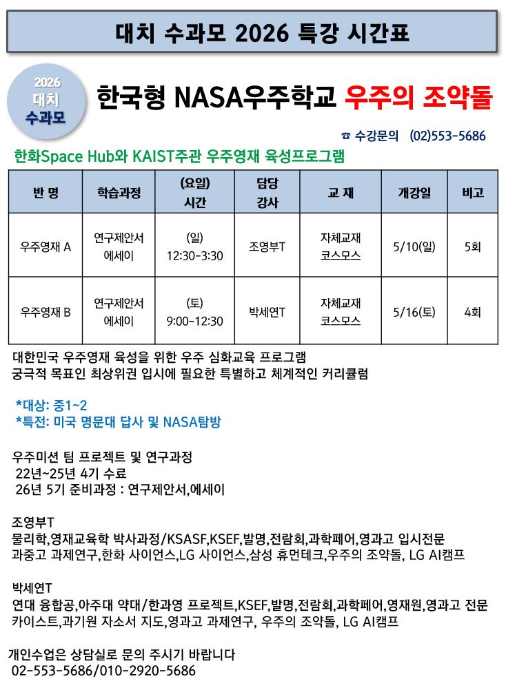 한화 Space Hub와 KAIST 주관 우주영재 육성 프로그램 5기모집 우주영재 육성을 위한 우주심화 교육 선발 기준:우주에 대한 열정,풍부한 창의력,인문학적 소양을 갖춘 학생 대상: 중1~2 학생 (30~45명 내외로 기수별 모집 인원 다름) 평가 1차 서류: 2000자 내외 연구 제안서(에세이) 2차 면접: 제출 서류기반 10~15분 1:1면접 최종 합격자 발표: 6월말~7월초 교육기간: 7월~12월 (6개월간 10회 내외 교육 및 우주미션 팀프로젝트 진행) 특전 KAIST 총장명의 수료증 수여 KAIST 영재교육원 수강권 지급 국내,외 연수 미국 명문대 답사 및 NASA 탐방 https://vo.la/dWosVb <img src="https://blogthumb.pstatic.net/MjAyNjA0MTlfNTMg/MDAxNzc2NTczNTAxMDQ5.camuiYYrPGaVY-duZAefs2hPkOau58NnVmYEnuknpEcg.2bLKCjuV1CV4BOwbVe7a7-Ums5AOpXYKOiODIn7acZEg.JPEG/%C4%B8%C3%B31.JPG?type=s3" />