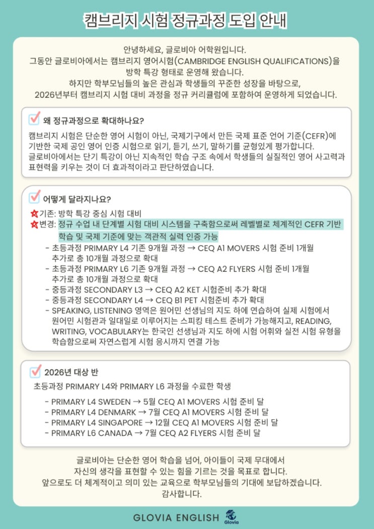 안녕하세요. 송파 위례 초중등 대상 어학원 글로비아 어학원입니다 캠브리지 하반기 정기시험 글로비아 학생들 전원 합격 축하합니다 원장선생님과 일대일 스피킹 테스트까지 철저하게 준비해서 간 시험!! 상반기 때 Pre-A1 YLE Starters보다 더 높은 레벨 A1 YLE Movers도 문제 없다 그동안 글로비아에서는 캠브리지 영어시험(Cambridge English Qualifications)을 방학 특강 형태로 운영해 왔습니다. 하지만 학부모님들의 높은 관심과 학생들의 꾸준한 성장을 바탕으로, 2026년부터 캠브리지 시험 대비 과정을 정규 커리큘럼에 포함하여 운영하게 되었습니다. 캠브리지 영어시험은 단순한 영어 시험이 아닌, 국제 기....... <img src="https://blogthumb.pstatic.net/MjAyNjA0MDhfOTYg/MDAxNzc1NjM0OTAzMDUx.1bhuthLXGLOaJkk3SYuUnCi6s7aVQRsXI7Ei1IgXZT4g.ufsAu6ZtwDY01pIYE6W32IvecFGqVFrJ_acDs1CqJ98g.JPEG/900%A3%DF29845601%A3%DF%C4%B7%BA%EA%B8%AE%C1%F6_%C1%A4%B1%D4%B0%FA%C1%A4_%B5%B5%C0%D4.jpg?type=s3" />
