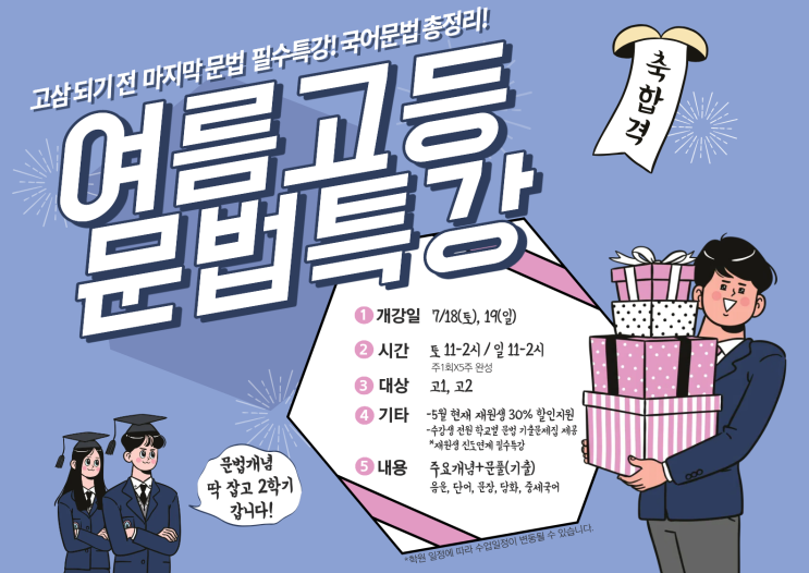중간고사가 한 달 남짓 남았습니다. 화목 / 수토 / 일요일 시간대 선택해서 들어올 수 있고 정규수업과 별도로 운영됩니다. 학교별로 나눠서 기출 분석하고, 오답 패턴에 맞는 맞춤 문제집까지 따로 구성해 드립니다. ✔️ 화요일 / 목요일 - 17:00 ~ 19:30 내신 대비 수업 - 19:30 ~ 22:00 정규 수업 → 하루 총 5시간 운영 ✔️ 수요일 / 토요일 (요일 선택 수업) - 수요일 17:00 ~ 22:00 내신 대비 수업 - 토요일 15:00 ~ 20:00 내신 대비 수업 ✔️ 일요일 (필수 참석) - 17:00 ~ 22:00 내신 대비 수업 자세한 상담은 네이버 예약을 통해 진행하고 있습니다.