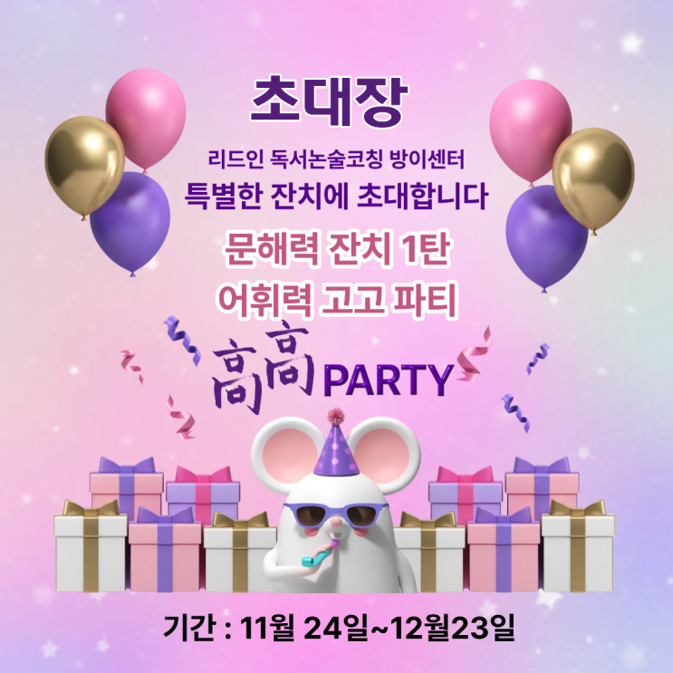 열심히 책을 읽는 아이들에게 또 다른 즐거움을 주기 위해 기획했습니다. 11월은 원래 리드인 방이센터 장터 행사가 있습니다. 그 행사를 12월로 옮기고 새로운 행사 문해력 잔치 1탄 어휘력 고고 파티 를 열기로 했습니다. 문해력을 키우는 어휘력 파티를 한다고 하니 그런 파티가 어디 있냐며 아이들이 아우성을 쳤습니다. 문해력 잔치는 1탄, 2탄 계속됩니다. 문해력 잔치 1탄의 어휘력 고고 파티는 한자어, 고사성어, 속담, 관용구를 익히고 테스트를 보면서 어휘력을 향상하는 파티입니다. 새로운 스타일의 파티 시험을 통과할 때마다 1급, 2급, 3급 한 급수씩 올라갑니다. 올라갈 때마다 스티커, 선물이 팡팡 공부하면서 급수도 올라가고 문....... <img src="https://blogthumb.pstatic.net/MjAyNTExMThfOCAg/MDAxNzYzNDUxMTA5MDQ4.deiutzTaqdV5DM7r5TMKezFixPpE5U7dn6kZLFfXhhMg.LpBHAZ8kHrrUUbPw0GQr8_J_FpldEFdvd1Fdlpm_p80g.PNG/%B9%AE%C7%D8%B7%C2_%C0%DC%C4%A1_1%C5%BA_%BE%C8%B3%BB%B9%AE_%286%29.png?type=s3" />