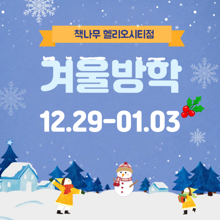 ❄️ 책나무 겨울방학 안내드립니다 안녕하세요, 책나무 학부모님들 어느덧 한 해의 끝자락이 다가오고, 아이들이 기다리던 겨울방학이 시작됩니다. 책나무는 아래 기간 동안 겨울방학을 갖습니다. 방학기간 : 2025년 12월 29일(월) ~ 2026년 1월 3일(토) 해당 기간에는 모든 수업이 쉬어가며, 재충전의 시간을 통해 더 즐겁고 알찬 수업으로 찾아뵙겠습니다. 아이들도 한 해 동안 수고 많았고, 학부모님께도 따뜻하고 편안한 겨울휴식이 되시기를 바랍니다. 방학 후 더욱 건강하고 밝은 모습으로 만나요! 감사합니다 ☺️ <img src="https://blogthumb.pstatic.net/MjAyNTEyMDVfMTY2/MDAxNzY0OTIxODE5ODIx.9oDdY3ZPG9dnXy5pCRyvAdMLr2K_lrQkoV1o7z8sj24g.PgPGvYYbb0WkihG3ju2lIY5nbdoLxmB0iAMU0DCzrzEg.PNG/%B0%DC%BF%EF%B9%E6%C7%D0.png?type=s3" />
