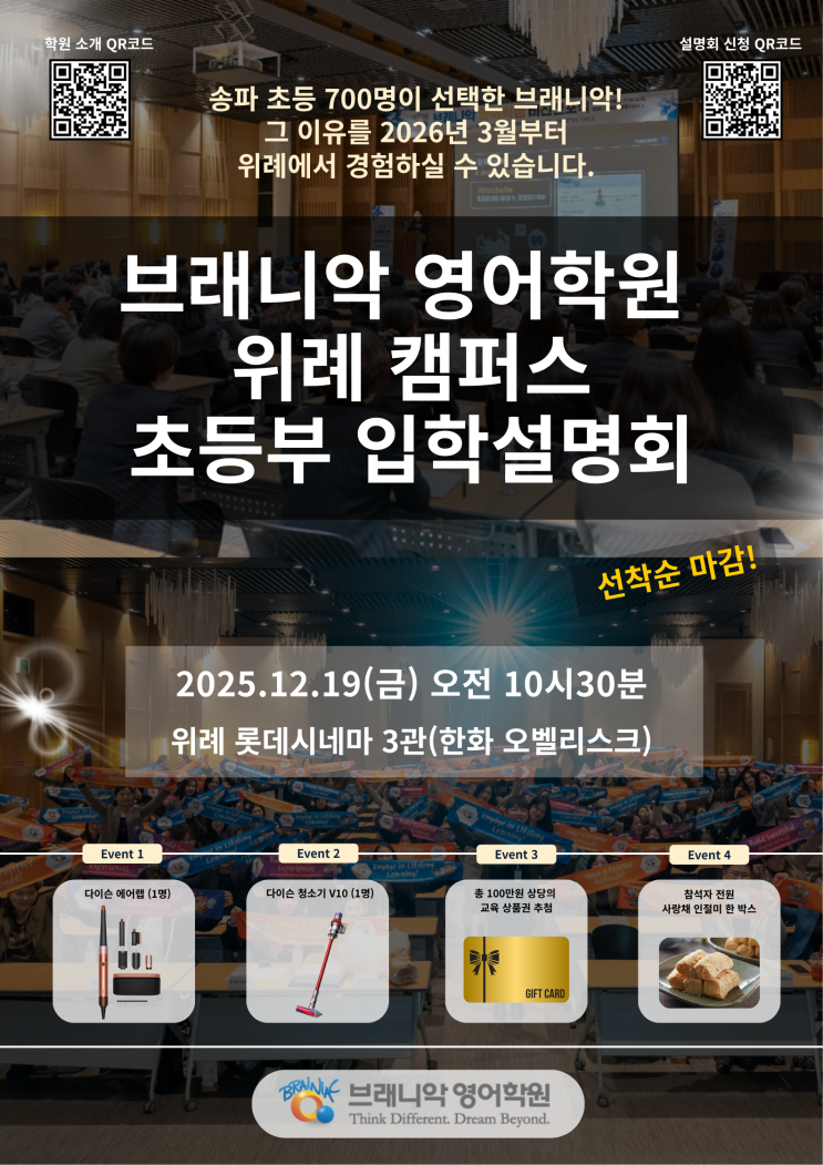 2026년 3월, 위례에서 브래니악이 새로운 초등 영어교육의 기준이 됩니다. ◆ 브래니악영어학원 위례캠퍼스 첫 입학설명회 안내 ◆ ▶ 대상 : 예비초1~예비초6(2025년 기준) ▶ 일시 : 2025년12월19일(금) 오전 10시30분 (약 100분 소요) ▶ 장소 : 위례 롯데시네마 3관 (위례 한화 오벨리스크 지하 1층) 주차 3시간 지원 가능합니다 ▶ 설명회 참석자 특전 ◀ 특전 1. 무료 레벨테스트 쿠폰 증정 특전 2. 다이슨 에어랩 추첨(1명) 특전 3. 다이슨 청소기 추첨(1명) 특전 4. 브래니악 교육상품권 추첨 (총 100만원 상당) 특전 5. 사랑채 인절미 한 박스 (설명회 후 참석자 전원 대상) 특전 6. 초등 필수 습관 보드 ▶ 브래니악 입학설명회 주요 내....... <img src="https://blogthumb.pstatic.net/MjAyNTEyMDZfMTYg/MDAxNzY0OTg4NTc2MDY2.s6No9qpf5xN996MQP9ZPQmpRzjNNF2so1avyfyrc2pog.PbU0PYmCxM_ZwXlIL07Gbg_ADRG--4C106fxSd98_NIg.PNG/%BA%EA%B7%A1%B4%CF%BE%C7_%BF%B5%BE%EE%C7%D0%BF%F8_%C0%A7%B7%CA_%C4%B7%C6%DB%BD%BA.png?type=s3" />
