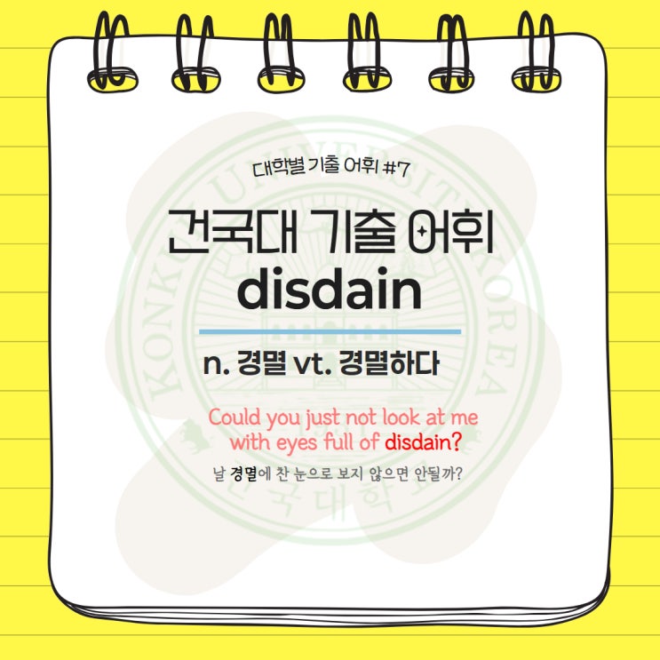 안녕하세요 강남 송파 중랑 서초 잠실 강동 별내 위례 광진 천호 구리 남양주 하남 김영편입 잠실캠퍼스 입니다. 편입영어를 준비하는 많은 학생들은 편입영어가 어떻게 쓰이는지 편입단어가 어느 정도 수준인지 궁금하실 거예요 기출단어를 암기하시는 게 어려우신가요? 걱정하지 마세요! 편입영어가 어려운 어려분들을 위해 대학별 기출어휘를 준비했어요!! 김영편입 잠실캠퍼스와 함께 편입영어를 보다 더 쉽게 외워봐요 오늘 배울 단어는 disdain 뜻은 n. 경멸 vt. 경멸하다 라는 뜻이에요! 동의어로는 n. 경멸, 멸시 = contempt, scorn vt. 경멸하다 멸시하다 = despise, slight, snub 가 있죠! 건국대에서 빈출했던 기출 어휘인....... <img src="https://blogthumb.pstatic.net/MjAyNjA0MjlfMjE0/MDAxNzc3NDIyNTg2Nzk5.nOFt0Yudw7XHLSUvcX8vPao6b-1Z2hkAUbLCsiq--X4g.MQORBRGvpDN-nDRItxc-X55eSYrAZIgei0jVORI2xbIg.JPEG/%B4%EB%C7%D0%BA%B0_%B1%E2%C3%E2%BE%EE%C8%D6_7.jpg?type=s3" />
