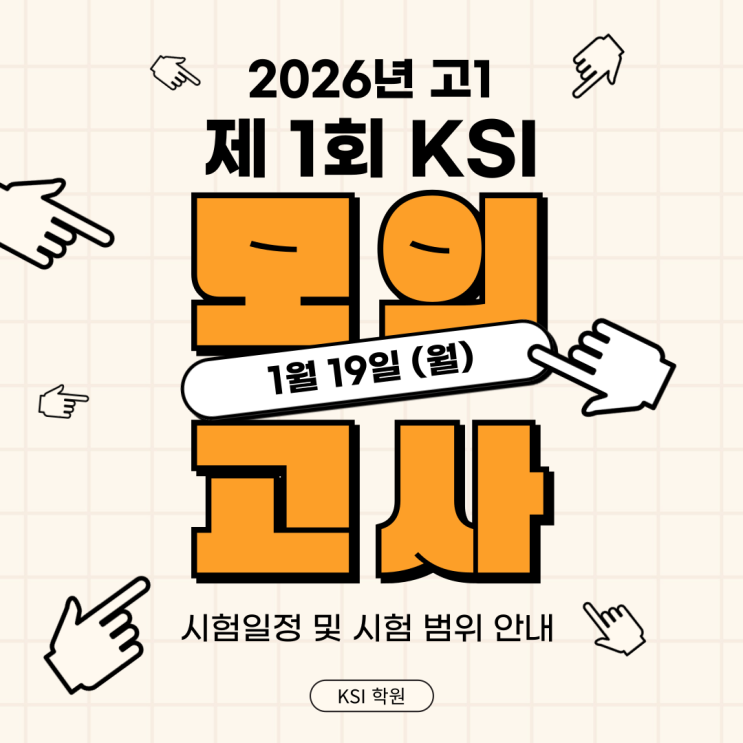 안녕하세요! KSI학원입니다. 올해도 예비고1 학생들의 첫 시험을 위해 KSI 모의고사를 실시합니다. ️2026. 1. 19. 월요일 현재 수강하지 않는 과목도 응시 가능하며 자세한 사항은 첨부한 이미지를 참고해주시기 바랍니다. [수업 문의 및 수강 신청] KSI학원 (서무과) 055-311-0963 (문자 또는 카톡) 010-6502-0963 KSI학원 카톡 채널 http://pf.kakao.com/_wIAmn - KSI학원 - <img src="https://blogthumb.pstatic.net/MjAyNjAxMDlfOTgg/MDAxNzY3OTQ0MzgyNzE2.oPIRHypU0L7eg58sG0HS_54ev_IdhGVbd9MXzvyYEmUg.pPz7pwN1ax4brhrXLMPP2owbcW9_69TGi2s3P9MlPd4g.PNG/%B8%F0%C0%C7%B0%ED%BB%E7_%B0%F8%C1%F61.png?type=s3" />