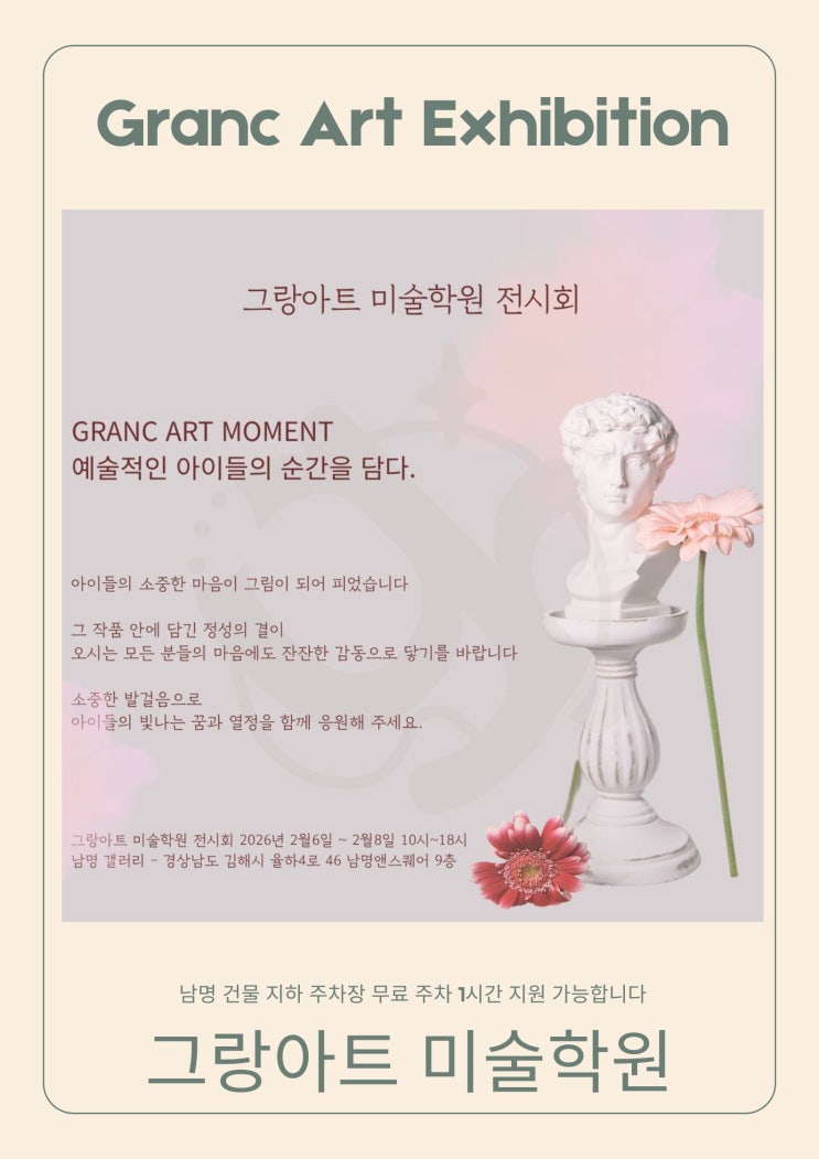 ** 2월 6일 금요일은 작품 디피로 인해 14시부터 전시 관람이 가능합니다 ** 그랑아트 미술학원 4번째 전시회에 소중한 학부모님을 초대합니다 이번 전시는 아이들이 한 작품, 한 작품에 정성과 시간을 담아 준비한 소중한 결과물로 이루어졌습니다 전시라는 특별한 경험을 통해 아이들은 미술이 단순한 수업을 넘어 하나의 넓은 세계임을 이해하고, 자신의 그림을 많은 사람들 앞에 선보이며 표현의 기쁨과 성장의 순간을 마주하게 됩니다 작품 속에는 아이들 각자의 시선과 감정, 그리고 그동안 차곡차곡 쌓아온 노력과 배움이 고스란히 담겨 있습니다 귀한 걸음으로 아이들의 소중한 전시 자리를 함께해 주세요 ^^ 아이들의 작은 손에서 시작....... <img src="https://blogthumb.pstatic.net/MjAyNjAxMTJfMjU0/MDAxNzY4MTk0ODk4MTc3.LEm1GkuSgD2nxaYXp3OZkpkXHcI1wjXIIDf8hbH-5iIg.XxeJnH3ulwtsycUqbHyhPIy9JEMXojLnvnBUHIPr8RUg.JPEG/MIRICANVAS_ITEM_COPY_KEY.jpg?type=s3" />