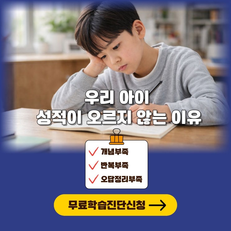안녕하세요? 해법플러스에듀학원입니다. “열심히 하는데 성적이 그대로라면 이유가 있습니다” 아이를 보면 분명 공부를 안 하는 것도 아닙니다. 숙제도 하고 문제집도 풀고 학원도 다니는데 시험 점수는 그대로인 경우가 많습니다. 많은 학부모님들이 이런 고민을 하십니다. “우리 아이는 왜 이렇게 성적이 안 오를까요?” 사실 대부분의 학생들은 공부를 안 해서가 아니라, 방법이 틀려서 성적이 오르지 않습니다. 오늘은 학습 상담을 하면서 가장 많이 발견되는 성적이 오르지 않는 핵심 원인 3가지를 알려드리겠습니다. 1️⃣ 개념 부족 많은 학생들이나 학부모님들은 문제를 많이 풀면 성적이 오를 것이라고 생각합니다. 하지만 개념 이해....... <img src="https://blogthumb.pstatic.net/MjAyNjAzMTZfOTYg/MDAxNzczNTk1OTcyNDI1.WJzpE3kP7_WKdc2XtvaWPCgx_EiVzbuyd08O00-xpZsg.ad6ytEkQFudyuBgKinr-3o0NBkdnfs5JnDhUkNH2oYUg.JPEG/1200x1200-_%BA%B9%BB%E7%BA%BB.jpg?type=s3" />