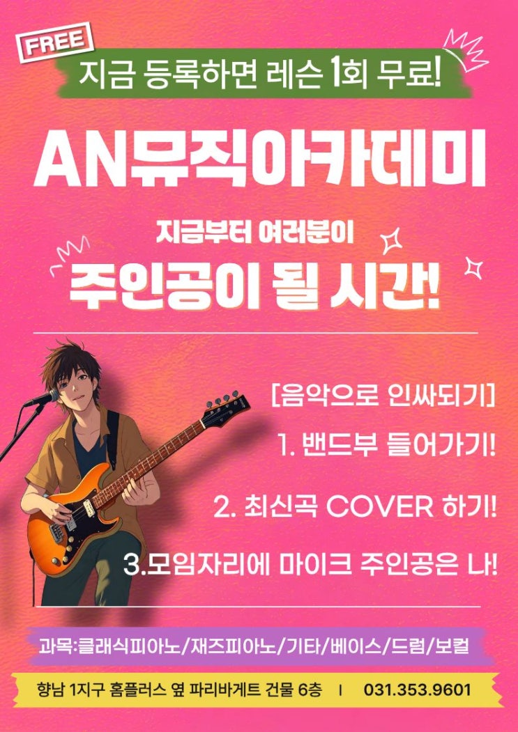 안녕하세요. AN뮤직아카데미 입니다. 오랜만에 등록 이벤트를 진행하오니 많은 관심 부탁드립니다~ ** 지금 등록하면 레슨 1회를 더 무료로 받을 수 있는 기회** 놓치지 마세요! <img src="https://blogthumb.pstatic.net/MjAyNjAzMTlfMjAw/MDAxNzczOTA1NDE1NzE1.2YPkTuwqSYvCi6khW-CYDS3EPjiGN5B82dseCeMSj8Qg.Qfac61lVVIBRkYUjDZ2heJQ0h7HOzHcV8_x-5hqvKgwg.JPEG/%C1%A6%B8%F1%C0%BB_%C0%D4%B7%C2%C7%D8%C1%D6%BC%BC%BF%E4._%2836%29.jpg?type=s3" />