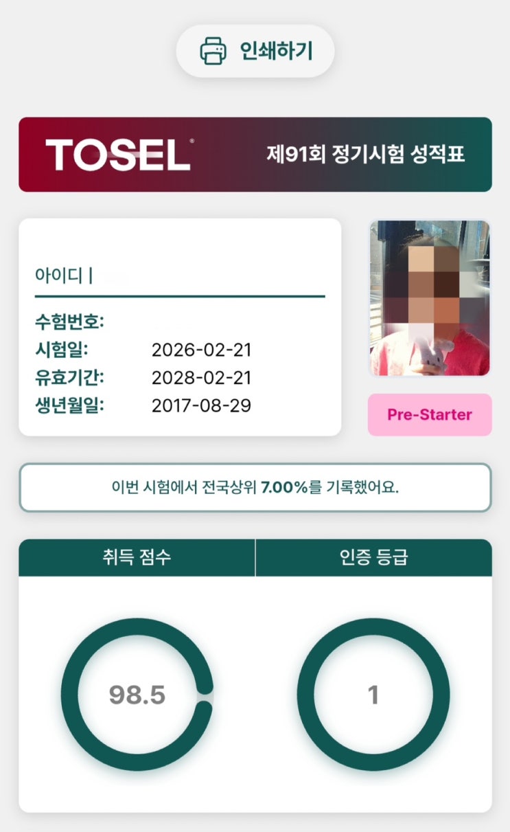 최근 저희 학원 학생이 TOSEL 시험에서 98.5점으로 1등급을 받았습니다 사실 시험 결과를 확인하면서 저도 정말 놀랐습니다. 단 한 문제 차이로 만점에 가까운 점수였기 때문입니다. 하지만 곰곰이 생각해보니, 이 결과는 갑자기 나온 점수가 아니라 그동안 차근차근 쌓아온 학습 과정이 만들어낸 자연스러운 결과라고 느껴졌습니다. ⸻ 기초를 쌓아온 시간들이 만든 결과 저희 학원에서는 시험 점수만을 목표로 공부하기보다는 영어의 구조와 기초를 이해하는 학습을 가장 중요하게 생각합니다. 주어와 동사의 구조를 이해하고, 시제에 따라 문장이 어떻게 달라지는지 배우고, 문장을 읽고 의미를 파악하는 힘을 키우는 것. 이러한 기....... <img src="https://blogthumb.pstatic.net/MjAyNjAzMTFfMzQg/MDAxNzczMjIyMTM4ODAy.YifdNMTI1B2lb3CWYk5pevbdcPzyM_Kbz2O2yAH51ekg.49gEqpKq4c8UGiEKAQUvlaHeiJAFGlyYbOnzcfPn6BQg.JPEG/IMG%A3%DF6248.JPG?type=s3" />