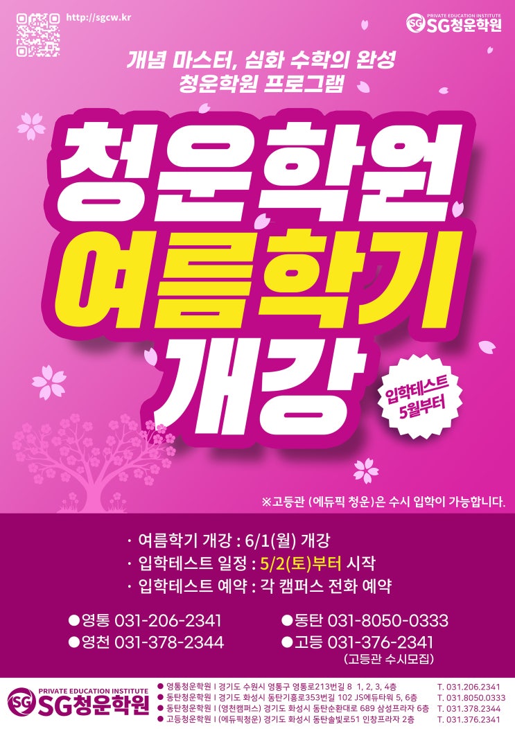 2026 여름학기 개강 소식! :: SG청운학원 안녕하세요. 수학, 과학 입시 전문 SG청운학원 입니다. 학기 마무리와 새학기를 준비하는 여름학기가 다가왔습니다. 여름학기의 시작에 맞춰 청운학원에서는 26년 6월 여름학기 신규 입학테스트를 진행합니다. 신규 학생들은 대수 또는 기하과정을 꼼꼼히 테스트 점검하여 본인의 학습 상황에 맞춰 반 배정 및 최상의 수업을 진행할 예정이오니 많은 관심과 참여를 바랍니다. ● SG청운학원 26년 여름학기 개강 안내 -개강일 : 2026.06.01 (월) -입학테스트 : 2026.05 부터 -테스트 진행 : 개개인의 최근 진도 대수, 기하 파트 택 -테스트 문항 : 총 25문항 (총 60분) (과정에 따라 차이가 있을 수 있습....... <img src="https://blogthumb.pstatic.net/MjAyNjA0MjlfMTk0/MDAxNzc3NDQ1ODEwMjA5.xjtsWAQjcAUCozGsYJlu6OGz85FRAQrhLbvl570RTD0g.CmBmVITUBV5L_CMZ2Wi2Roy4RKPGpif6pWBl3lY4SgEg.JPEG/%C3%BB%BF%EE%C7%D0%BF%F8-%BA%BD%C7%D0%B1%E2%B0%B3%B0%AD_%2826.06%29_resize.jpg?type=s3" />