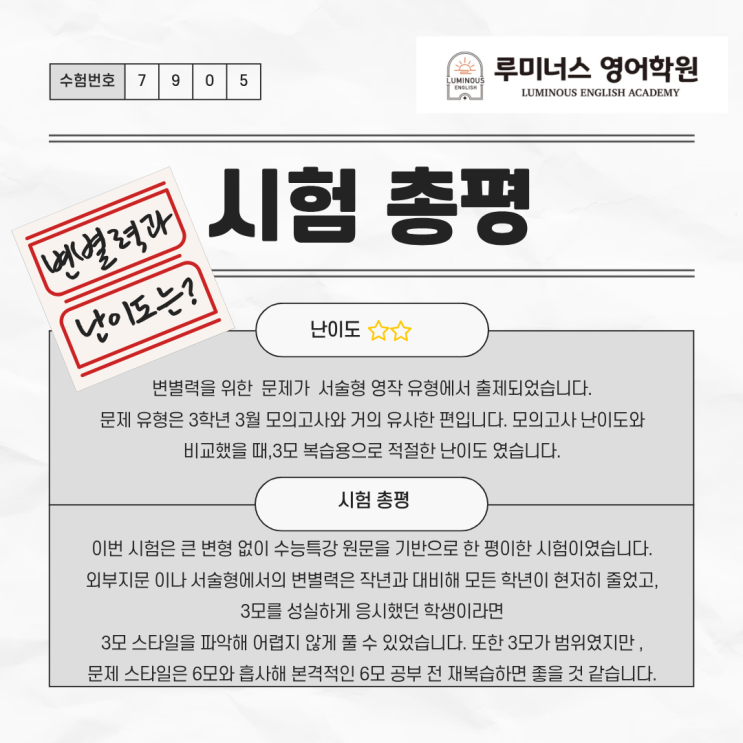 2026학년도 1학기 중간고사 정현고 3학년 영어시험이 마무리되었습니다. 이를 바탕으로 루미너스 영어학원에서는 이번 정현고 영어시험 분석으로 출제 경향 분석과 다음 기말고사 대비 방향을 알려드리겠습니다. 결론부터 말씀 드리자면, "3모 복습하게 냈으니 6모 대비해라" 입니다. 정현고는 주로 시험의 난이도 조절을 같은 의미에서의 낯선 단어들로 변형이 이루어집니다. 따라서 아이들이 같은 지문이라도 낯설게 느끼는 이유가 여기에 있습니다. 수능특강에 기반한 철저한 복습 속에서도 다가올 6모를 대비할 큰 나침반이 되어주었습니다. 정현고 3 성적 예측 출제 경향성 파악 루미너스 영어학원 만의 1:1 맞춤 학습 전략 같은....... <img src="https://blogthumb.pstatic.net/MjAyNjA0MzBfMSAg/MDAxNzc3NTQ5MjY4MjI4.kqjZ-fQ1sAA7Y48djhbh-vVoFF8IZsUG2UtuDwDn4UMg.EG2Wq28fQtFTIX5IPubaHwyyc01SnKFrlrzj1Gh8rQYg.PNG/%C1%A4%C7%F6%B0%ED_%BD%C3%C7%E8_%C3%D1%C6%F2_%BD%E6%B3%DA_%282%29.png?type=s3" />