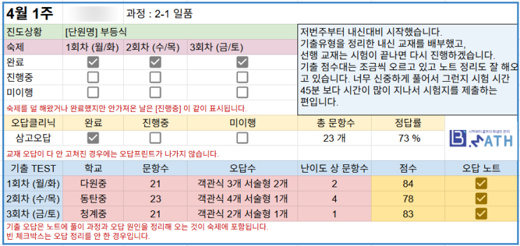 청계중 2학년 A학생의 사례를 소개합니다. 중등부는 4주 내신대비를 하고 매주 내신대비 피드백을 학부모님 카톡으로 공유해드렸어요. A학생 어머님께 보내드렸던 걸 보시면 빌드업 과정이 한 눈에 보이실 거예요. 4월 1주차 이미 중간고사 과정을 개념원리,쎈,일품으로 공부한 학생이었으나 기출 시험은 처음이라 점수대가 높지 않았습니다. 2025 동탄지역 기출을 수업시간 마다 한세트씩 시간 재고 풀었고 오답은 노트정리를 하게 했습니다. 노트 정리를 했어도 일주일치 기출 오답은 다시 그 다음주 첫 수업때 오답 프린트로 다시 줬어요. 한번 풀고 공부했던 문항을 확실하게 공부가 되었는지 한번 더 확인하기 위해서 학생 한명 한명 밀.착....... <img src="https://blogthumb.pstatic.net/MjAyNjA0MzBfMTA5/MDAxNzc3NTM5MzY3Njc2.O6AgIvvJvg_CUkqHzR8Kv5S4qAwnUfJDIomeQGLuu8Yg.cRXMUtlDFupxg6Eoj71z-kbvxP-m41y--Gp1MYosVrog.PNG/image.png?type=s3" />