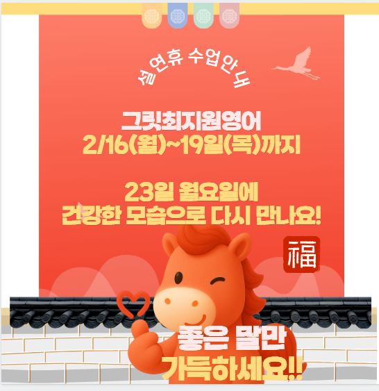 안녕하세요~ 영어를 언어답게!! 많이 듣고! 많이 읽는! 동래 온천동 영어학원, 그릿최지원영어에서 설연휴 수업일정 안내드립니다!! 한해동안 묵묵히 영어소리 채우기에 열심이었던 우리 친구들!! 설연휴동안 가족들과 행복한 시간 보내고 또 새로운 마음으로 힘찬 말처럼 열심히 달려보자!! 사랑해♡♡♡ <img src="https://blogthumb.pstatic.net/MjAyNjAyMTBfMTEx/MDAxNzcwNjg0MTc5NTE1.NRQLSp1TlOnTsEg8Tji6vrgLlvnAAFGzeoI5zuZ-PX4g.YLbHjXZRLjXVQY03TgWxhhzlgCDmf2BsuN4xQnTmNecg.PNG/%BD%BA%C5%A9%B8%B0%BC%A6_2026-02-10_0942052.png?type=s3" />