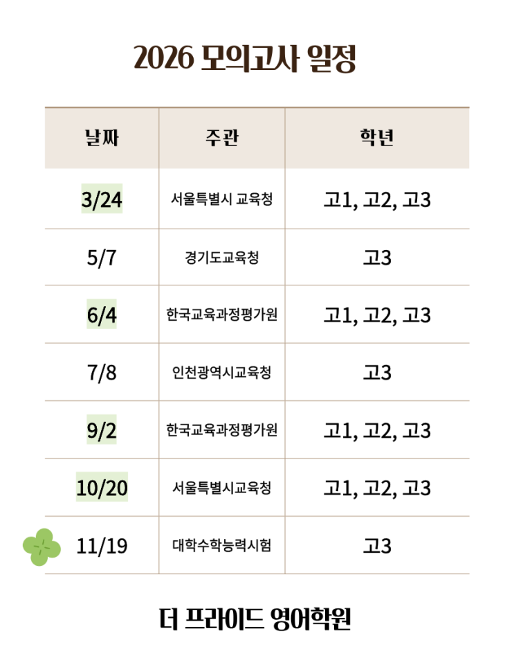 [화명동 영어학원 더 프라이드] 2026 고등 모의고사 일정