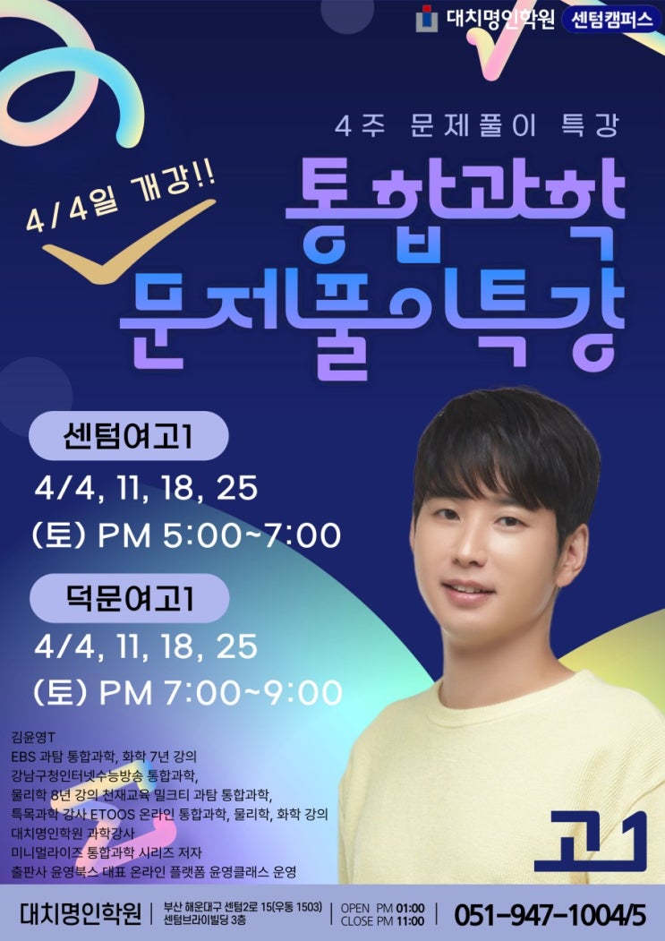 김윤영T 통합과학 4주 문제풀이 특강(센텀여고/덕문여고) [센텀여고1] 4/4, 4/11, 4/18, 4/25 (4회) (토) PM 5:00~7:00 [덕문여고1] 4/4, 4/11, 4/18, 4/25 (4회) (토) PM 7:00~9:00 김윤영T profile EBS 과탐 통합과학,화학 7년강의 강남구청 인터넷 수능방송 통합과학, 물리학 8년강의 천재교육 밀크티 과탐 통합과학, 특목과학 강사 ETOOS온라인 통합과학,물리학,화학 강의 대치명인학원 과학강사 미니멀라이즈 통합과학 시리지 저자 출판사 윤영북스 대표 온라인 플랫폼 윤영클래스 운영 ◐수강신청 바로가기 https://bs.myunginedu.co.kr/branch/schedule.php?grade=high1&part=%EB%82%B4%EC%8B%A0 ☎문의 0519471004....... <img src="https://blogthumb.pstatic.net/MjAyNjAzMjFfMjA3/MDAxNzc0MDU3MTY2MjEy.sL89CsSI7YGhGwUERCcm1zxtPzSImWzBWiVIBkyE81sg.wrxymKj_lswiOa6DZBLSdPC54eyAWnOUqNer_XMMuEkg.JPEG/j_0g9Ud018svcxhua6n7x96hb_fr3cpk.jpg?type=s3" />