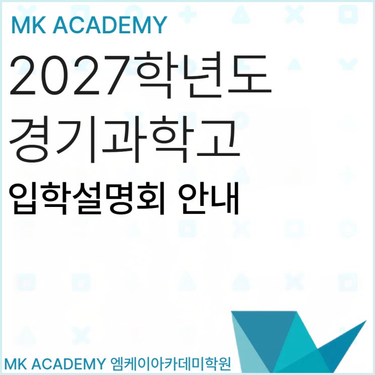 과학영재학교 경기과학고등학교 입학설명회 안내 안녕하세요? MK아카데미학원입니다. 영재학교 지원을 고민하고 계신 학생 및 학부모님들께 도움이 될 수 있는 경기과학고등학교 입학설명회 소식을 안내드립니다. 학교의 전형 방향과 준비 흐름을 직접 확인할 수 있는 자리이기 때문에 관심 있으신 분들께서는 일정을 꼭 확인해보시기를 권해드립니다. 2027학년도 경기과학고 입학설명회 일정 과학영재학교 경기과학고등학교에서는 2027학년도 신입생 선발을 위한 입학설명회를 다음과 같이 운영합니다. 일시 : 2026년 4월 4일(토) 오전 10시 ~ 11시 40분 장소 : 경기과학고등학교 과학영재연구센터(SRC) 지하 1층 컨퍼런스홀 이번 설명회에서는....... <img src="https://blogthumb.pstatic.net/MjAyNjAzMjFfMjE1/MDAxNzc0MDc3NTYwMDkw.ar01SHRHImGJHrZYw2mGQ7b2HhL_HKjvDl-SkNtE4oAg.SCCJd75q5o36BW2Cl9d6ssKrssGmWdW9GV7vdpsyQQAg.JPEG/%B1%B3%C0%B0%C1%A4%BA%B8_-_2026-03-21T161915.409.jpg?type=s3" />