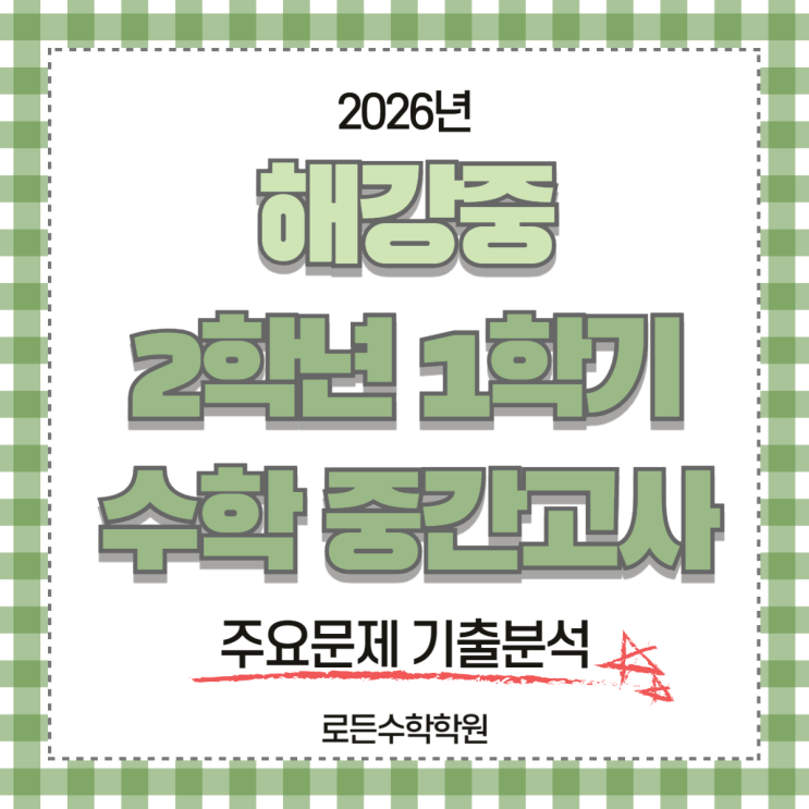안녕하세요, 로든수학학원입니다. 오늘은 2026년 해강중학교 2학년 1학기 중간고사 수학시험 주요문제 기출분석을 해보려고 합니다. 해강중2 1학기 중간고사 시험범위 해강중2 1학기 중간고사 시험범위는 1-1단원 : 유리수와 순환소수 2-1단원 : 단항식의 계산 2-2단원 : 다항식의 계산 3-1단원 : 일차부등식 3-2단원 : 일차부등식의 활용 으로 진행이 되었습니다. 해강중2 단원별 문제 출제 수 주요문제 기출분석 [ 해강중 7번 문항 및 손풀이 ] [ 해강중 8번 문항 및 손풀이 ] [ 해강중 10번 문항 및 손풀이 ] [ 해강중 13번 문항 ] [ 출처 : 학교 학습지 3번 ] [ 해강중 15번 문항 ] [ 출처 : 교과서 변형 2-1단원 30번 ] [ 해강중 16번 문항....... <img src="https://blogthumb.pstatic.net/MjAyNjA0MjNfMTEw/MDAxNzc2OTI4NjY5OTI1.enP_jNVSLFI83QN1EiFuVUBbI8F0cWZ3YRgNZw5dQRcg.L1JGPcRz2MdnqIEt_0pNG5d2SKO0gAHlQQgNML-d8NEg.PNG/001.png?type=s3" />