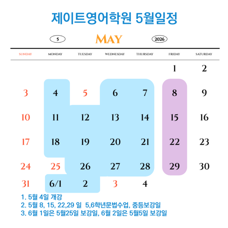 1. 5월 수업은 5월 4일(월)에 시작합니다. (6월 2일까지 5월 수업이에요.) 2. 등록기간: 4월 27일(월)~5월 3일(일)입니다. 3. 5월 8일, 15일, 22일, 29일은 초등5,6학년 문법수업, 그리고 중등 보강일입니다. 4. 중학생은 월, 수/ 화,목 5시부터 수업입니다. 5. 정규수업, 특강은 교육청에 신고한 횟수로 진행하고 있습니다. 아이들의 교육에 최선을 다하겠습니다. 고맙습니다. #2026년5월일정 <img src="https://blogthumb.pstatic.net/MjAyNjA0MjRfMjcx/MDAxNzc2OTc5MTk4Nzc3.LasHw74Hnm95L2I2uHRR-TiiQry23hVLI9RXQuyuLG4g.5pgqyvsbkjHs339qGJ1L3g3WisLMbBDTjr4L_1Igfjog.PNG/IMG%A3%DF9394.PNG?type=s3" />