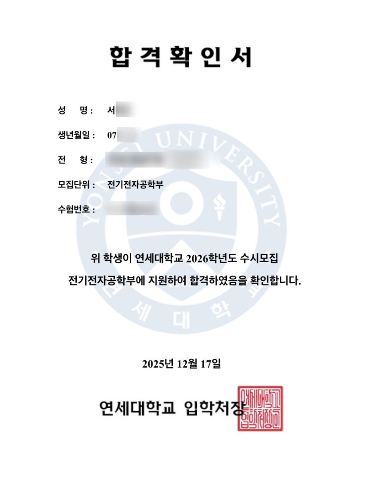 연세대와 고려대학교를 수시로 합격하고, 수능 수학 1등급 받은 해강고등학교 서ㅇㅇ 학생을 인터뷰했습니다 인터뷰 내용은 최대한 학생의 얘기를 전달할 수 있도록 간단하게 가다듬는 수준으로 정리했습니다. Q1 : 해강고 입시 결과는? 이번 학년 친구들이 황금세대라는 말이 많았는데, 생각한 것만큼 결과가 좋은 것 같지는 않다. 서울대 수시 1차 합격자가 학교에서 세명이 나왔는데, 다 떨어졌고, 최저떨도 많이 생긴 것 같다. 대신 논술로 대학 잘 가는 친구들이 꽤 많더라. Q2 : 해강고를 어떻게 평가하나? 사람 수가 많다는 점이 내신 따기엔 정말 유리하다고 생각한다. 그리고 학업 분위기 안 좋다는 말이 있는데, 사실 모든 학교가 다 할....... <img src="https://blogthumb.pstatic.net/MjAyNjAxMTBfMjM2/MDAxNzY4MDMwOTYwMTYy.tHxDMMJ7l4veVl4g4ClSgpyL4zvZkStBlWlkXftlwT4g.gPqCHQOCBe_psp_dsXgci_-ni7B_psLKGgW8HkxdffEg.PNG/image.png?type=s3" />