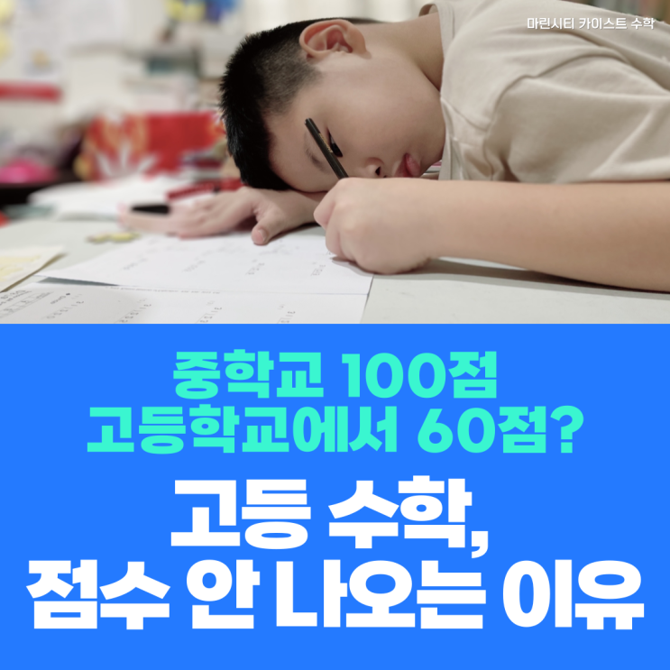 중학교 100점, 고등학교에서 60점? 고등학교 수학에서 점수가 폭락하는 진짜 이유 안녕하세요, 해운대 마린시티 중고등 수학 학원! 카이스트수학입니다. "중학교 땐 잘 하다가도, 고등학교 땐 모르는 거니까요..." "분명 100점 잘 맞던 아이였는데..." 실제로 중학교 시절 수학 100점을 놓치지 않던 학생들이 고등학교 첫 시험에서 충격적인 점수를 받는 경우가 적지 않은데요. 이러면 학부모님들도 속상하시겠지만, 아이들은 두 배로 더 속상할 겁니다. 본인도 본인 잘하던 걸 사실 그 누구보다도 스스로 잘 알고 있을테니까요. 중등 수학은 유형별 암기와 반복 훈련으로 어느 정도 고득점이 가능하지만 고등 수학은 탄탄한....... <img src="https://blogthumb.pstatic.net/MjAyNjAxMTRfNSAg/MDAxNzY4MzYyNzE4NDQy.SEHjCNbxx4kMONShqvBmu8odbhrzQUQekIV-aRElJW8g.P_e0joDM4IF-V3DUqlatxi2YdzWd37K-___l-VpyDdAg.PNG/070-1.png?type=s3" />