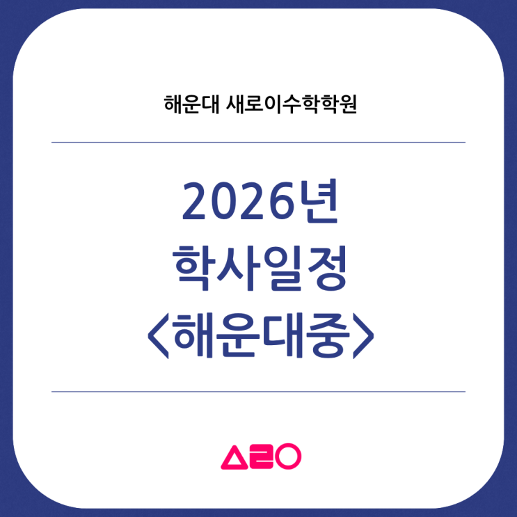 안녕하세요. 해운대 새로이수학학원입니다. 오늘은 부산 해운대중학교 학사일정을 정리하여 학생·학부모님들께 공유드립니다. 2026학년도 해운대중 학사일정 <1학기 일정> <2학기 일정> <학년 말 일정> ※ 시험 일정은 학교 사정에 따라 변동될 수 있습니다. ※ 출처 : 해운대중학교 학사일정 <새로이수학학원> 해운대중학교 수학 내신 대비 중학교 내신은 ☞ 학교 시험 유형 파악 ☞ 서술형 대비 ☞ 단원별 개념 누적 관리 가 매우 중요합니다. 중학교 수학 내신 대비 방식은 아래 블로그 글에서 자세히 안내드리고 있습니다. <<새로이수학>> ▼▼중학교 내신 대비 안내 바로가기▼▼ <img src="https://blogthumb.pstatic.net/MjAyNjAzMDJfMTk0/MDAxNzcyNDMxNjk1NDQ4.CC57-K3-hbhqtcXYu0DqZgE-krxhJb2XNpCx9EYGBMwg.6oNlNiNniRe_J9XssSHIuJPCMuSmqhjCd8zTYH7mKY8g.PNG/%C1%A6%B8%F1%C0%BB_%C0%D4%B7%C2%C7%D8%C1%D6%BC%BC%BF%E4..png?type=s3" />