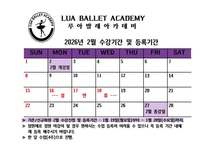 명지발레, 루아발레학원 2026년 2월 개강일자 및 수강등록기간
