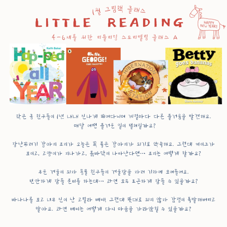 1월 선정 그림책 입니다. 1월 첫 주에는 사계절을 통해 한 해의 흐름을 알아보고, 겨울잠을 준비하는 동물들에 대해서도 이야기 나눌 예정입니다. 또, 추운 겨울날 실타래 하나로 마을 곳곳에 따뜻함을 전하는 한 소녀의 이야기와, 100개의 신발을 신어보려는 지네의 엉뚱하고 유쾌한 상상 속으로 함께 떠나보며 즐겁게 1월 클래스를 시작하고자 합니다. <img src="https://blogthumb.pstatic.net/MjAyNjAxMjJfMTA3/MDAxNzY5MDQ4Mzg0NTE2.Qm-4vsn5mlkTQP0mhijVEs6cwRtRezEP2MU-l2kJnjcg.bTBV-s6kB7JvwXhJaKLUXqCUyw2FJaDt_dCoGi9H1d8g.PNG/1%BF%F9_%B1%D7%B8%B2%C3%A5_%C5%AC%B7%A1%BD%BA_%A3%AD_1.png?type=s3" />