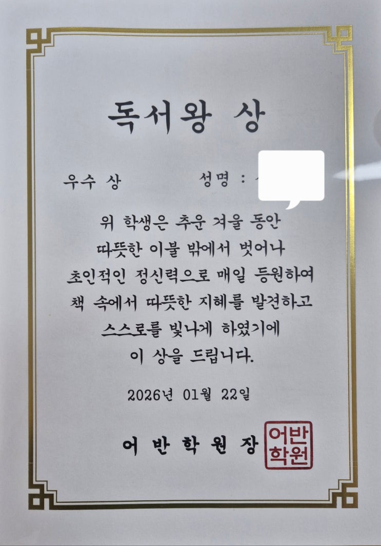 2026년 겨울방학 독서특강의 모든 일정이 끝났습니다. 1월 5일부터 22일까지, 딱 14일. 길다면 길고 짧다면 짧은 이 시간 동안 우리 아이들은 정말 놀라운 변화를 보여주었습니다. 지금 이 글을 쓰는 순간에도 마지막 날 아이들의 환한 미소가 떠오릅니다. 한 명 한 명 상장을 받아들며 뿌듯해하던 모습, 친구들끼리 서로 축하해주던 모습. 그 장면 하나하나가 이번 특강을 진행하며 느낀 보람을 고스란히 담고 있습니다. 이번 특강에서 아이들은 정말 놀라운 모습을 보여주었습니다. 매일 아침 교실에 들어서는 아이들의 눈빛은 반짝였고, 80% 퀴즈를 통과하기 위해 한 줄 한 줄 집중해서 읽는 모습은 그 자체로 감동이었습니다. 처음에는 다시....... <img src="https://blogthumb.pstatic.net/MjAyNjAxMjNfMjU0/MDAxNzY5MTI1NzA4NjQ5.5c0TwBrD539NABumlsfUiAfaNfRdh3UA5itR_ugMJsYg.14H1ZYUyVMSTvoYMfthQIIrrbo9_bMcRkk1vE26AC2kg.JPEG/%BB%F3%C0%E5.jpg?type=s3" />