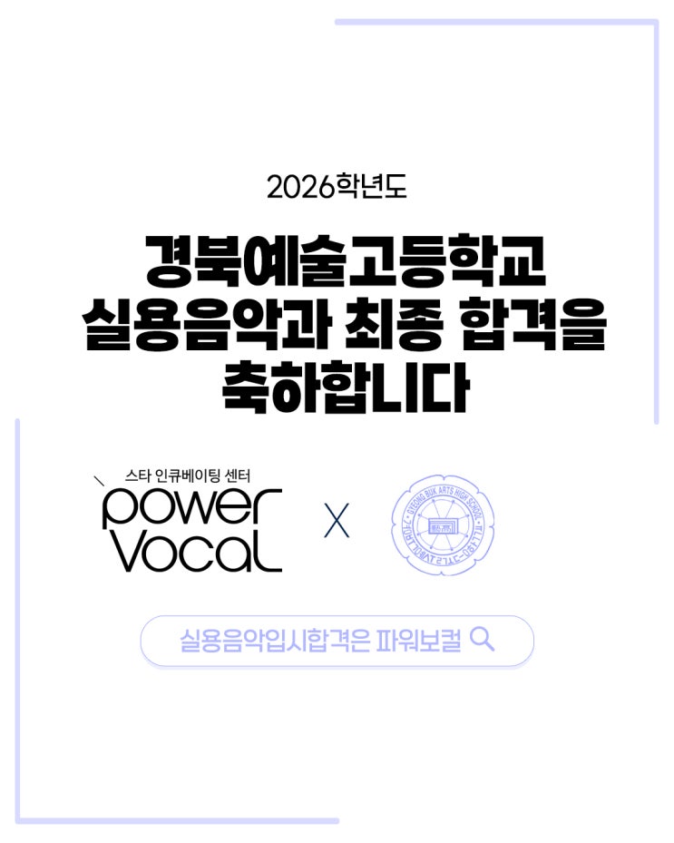 #예고합격 2026 경북예술고등학교 실용음악과 보컬전공 최종 합격을 축하합니다 올해도 입시 합격은 스타 인큐베이팅 센터 파워보컬 입시부터 데뷔까지 파워보컬이 함께합니다 < 파워보컬 인스타그램 > ‘보컬 체크업’이란? 노래하는 여러분의 현재 보컬 상태를 구체적으로 파악하여 레슨 시 기초 자료로 활용합니다 :) 녹음실에서 노래를 부르시면 총 15가지 항목을 체크, 노영주 대표님 또는 박성준 원장님과 함께 보컬의 문제점이나 궁금증을 1:1로 상담합니다! 이 때 평소 궁금하셨던 보컬에 대한 내용을 질문해 주세요 :) ✔상담 예약하기 예약 해 주시면 담당자 확인 후 파워보컬에서 연락 드립니다. :) 서울 본원 ....... <img src="https://blogthumb.pstatic.net/MjAyNjAxMTVfMTk3/MDAxNzY4NDY1NTgzNjYz.uN8PCTIIaPuQvlYYbBjB8M91_aGX60jq7xTGMqzc_pcg.XRrnKjvCA-57hBnl7meAtYy88_7FZUiKgsF_VJHSvxsg.JPEG/1.jpg?type=s3" />