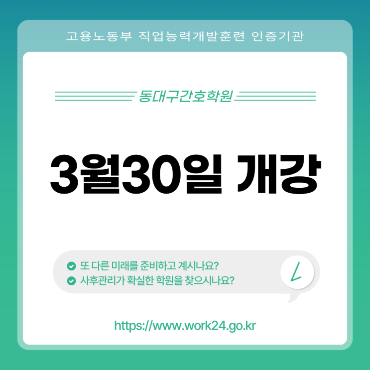 " 간호조무사! 망설이는 순간 정원 마감입니다 " " 취업부터 안정성까지… 답은 간호조무사입니다 " " 다시 일하고 싶다면, 간호조무사가 답입니다 " " 나이 걱정 없는 자격증, 간호조무사 도전하세요 " 간호·의료 분야로의 안정적인 취업을 고민하고 계시나요? 지금이 바로 간호조무사 자격증 취득을 시작하기에 가장 좋은 시기입니다. 대구 플러스간호학원 동구청점에서 2025년 봄 학기 개강 수강생을 모집합니다. 기초부터 자격증 취득, 취업까지 한 번에 준비할 수 있는 체계적인 교육 과정으로 많은 수강생분들이 선택하고 있습니다. 봄 학기 개강 일정 안내 < 국비 주간반 > 2026년 4월....... <img src="https://blogthumb.pstatic.net/MjAyNjAyMDhfMTUx/MDAxNzcwNTMwNjA3Mjg4._brGJgIqFrEN_AdBSrig5lqMlID3NdcMcSkOFpNa-QAg.ZXh4MDPat7VgMUaF96j6wXNM-F5eFvE7UzXS4bD3thwg.JPEG/2025.jpg?type=s3" />