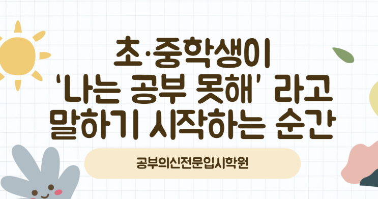 상담을 하다 보면 아이 입에서 가장 마음 아픈 말이 하나 있습니다. “저는 원래 공부 못해요.” 이 말을 하는 아이들을 보면 대부분 성적표가 완전히 무너진 상태도 아닙니다. 오히려 아직 충분히 가능성이 있는 아이들인 경우가 더 많습니다. 그런데 아이들은 어느 순간부터 스스로를 이렇게 규정해버립니다. 도대체 그 시작은 언제일까요? “이해는 안 됐는데, 질문할 타이밍을 놓쳤어요” 중학교 2학년 A학생 이야기입니다. 수학 수업 중 개념 설명은 반쯤 이해됐지만 문제로 들어가자 갑자기 손이 멈췄습니다. 질문하려고 했지만 이미 다른 친구들은 다음 문제로 넘어갔고 “지금 물어보면 나만 이해 못한 것 같을까 봐” 결국 아무 말도 하....... <img src="https://blogthumb.pstatic.net/MjAyNjAxMTZfODcg/MDAxNzY4NTM0MTEwOTQ1.sYH8sjr9BEyUIa1Xz5DxShvHryCYyzEYgLQML4XBxp4g.Zxa8DlX3gJioL9J7FIx74Fl4T9QA86Da1bGd4qBNmPUg.PNG/image.png?type=s3" />