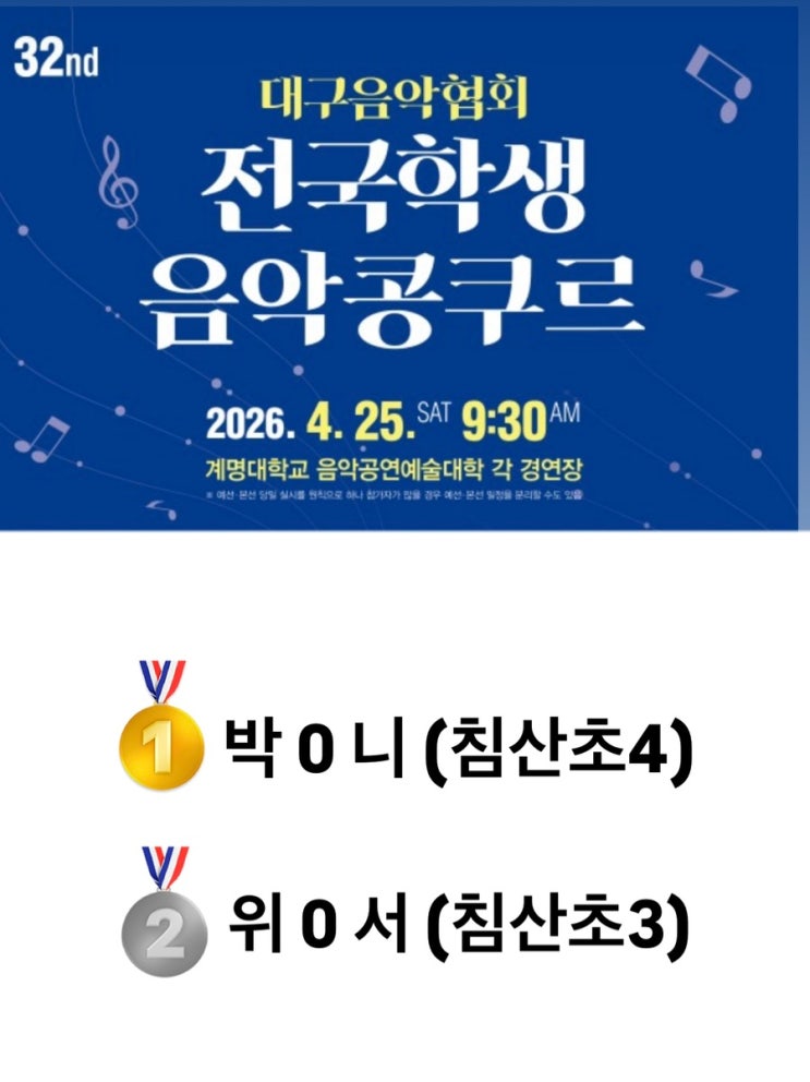 26년 메이저콩쿠르 입상 너무너무 축하해 <img src="https://blogthumb.pstatic.net/MjAyNjA0MjdfMjI0/MDAxNzc3Mjg4ODczOTYy.Zh3xm6llx4bzXJKD2dlpPbYJvp4fWFg81YCRpCyC4Skg.Ecb_TyZ2Y989lLgT9tUn2kwDXivnHnRWv_RYiMB0wTgg.JPEG/IMG_1494.jpg?type=s3" />