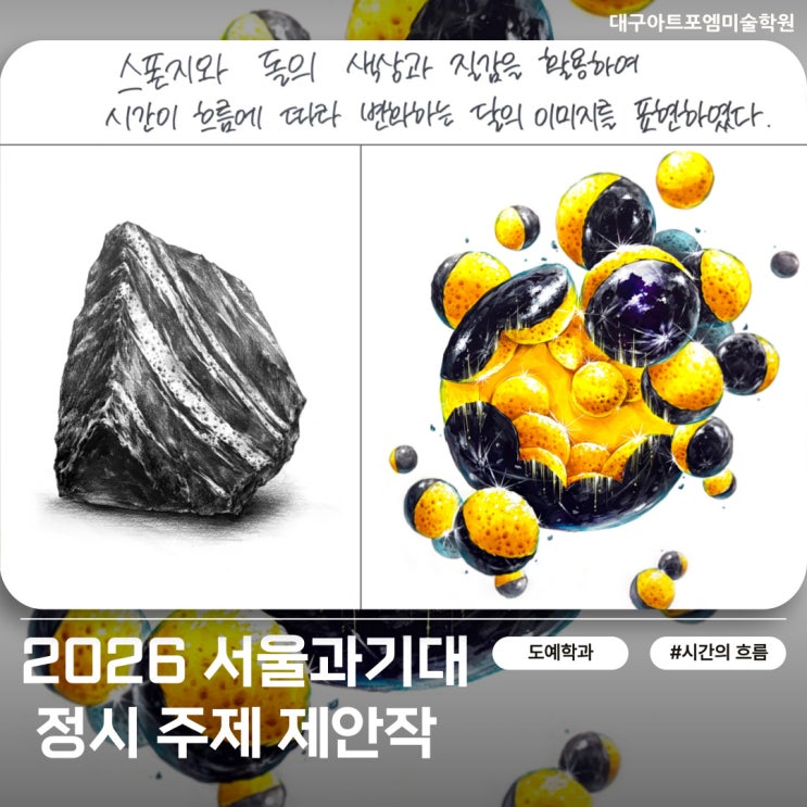 안녕하세요 수성구 범어동에 위치한 대구아트포엠미술학원입니다. 오늘은 서울과학기술대학교 2026학년도 정시 도예과 주제와 합격 제안작 포스팅입니다. 2026학년도 서울과기대 도예과 정시 주제로 스펀지와 돌이 출제 되었습니다. 소묘는 돌의 일부를 스펀지의 질감으로 변형하여 묘사하도록 나왔네요. 이번 2026학년도 수시에서도 그랬듯이 도예과의 경우 소묘파트는 A사물과 B사물의 질감을 변형하여 묘사하도록 꾸준히 출제가 되고 있습니다. 우측 디자인파트의 경우 수시에서도 이전과는 다른 형식의 주제가 출제 되었었는데요. 도예과 수시주제는 풍선을 터뜨리는 새의 모습을 그리시오. 였습니다. 이번 정시에서도 스펀지와 돌을 형태와....... <img src="https://blogthumb.pstatic.net/MjAyNjAxMjlfMjM4/MDAxNzY5NjYwOTgwMzE5.3yBakms_bbtKXZWWFC4gZp0M99xx4S7qvLHvxGOZzicg.Pcc4fbFZRaJ-z5iFMUGuVb-ADcHb7xZzw6dmgD4ZbyQg.JPEG/%C1%A6%B8%F1%C0%BB-%C0%D4%B7%C2%C7%D8%C1%D6%BC%BC%BF%E4_-002_%285%29.jpg?type=s3" />