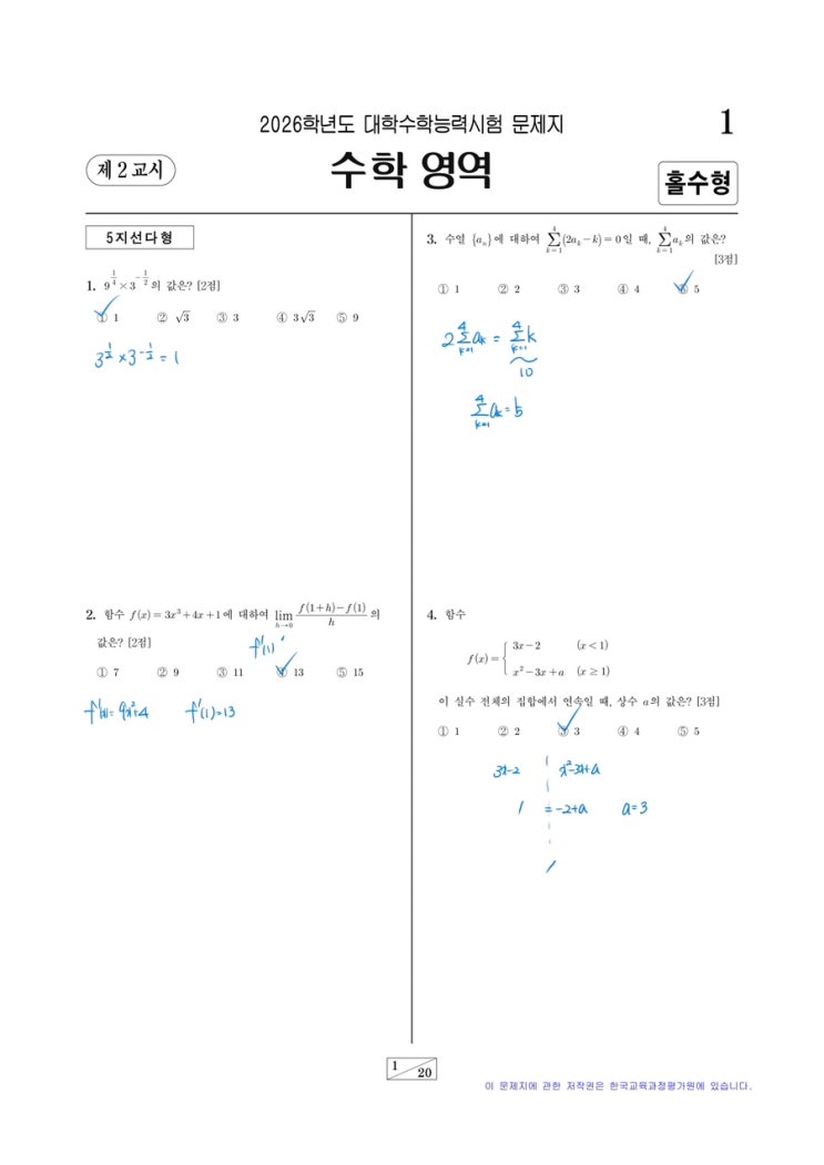 2026년 겨울 방학 특강이 활발하게 진행되는 와중에 글을 올립니다. 수능 이후 문제는 풀어봤으나 특강 준비를 비롯한 일련의 일들을 처리하다보니 좀 늦었습니다. 예상 등급컷 문제를 풀고 학생들과 풀이해 보며 느꼈지만, 작년 수능에 비해서는 확실히 쉬워진 감을 느꼈습니다. 특히, 10번대 4점 문항들이 비교적 빠르게 처리가 되는 느낌이 있다보니 뒷 문항에 시간을 쓸 여력이 있지 않았을까 하는 추측을 해봅니다. 문항별 손풀이 및 분석 공통 1번 - 수1 - 지수법칙 공통 2번 - 수2 - 미분계수 정의 공통 3번 - 수1 - 수열의 합 공통 4번 - 수2 - 연속 공통 5번 - 수2 - 곱의 미분법 공통 6번 - 수1 - 로그 성질 공통 7번 - 수2 - 정적분 넓....... <img src="https://blogthumb.pstatic.net/MjAyNTEyMjFfNzgg/MDAxNzY2Mjg3Mzc2ODk3.DvZCQqyUCJPvWqOLbXR-2roi3mFQA7S5iptWYtGY2b8g.Uq2HlHVa2DFFWgpkevXchSKu6zBm6fmtLn1-yeiNjUMg.JPEG/IMG%A3%DF1996.JPG?type=s3" />
