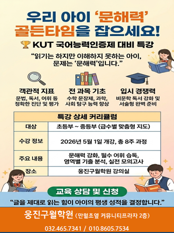 초등 성적의 결정판 '문해력', 웅진구월학원 KUT 국어특강으로 완성하세요!